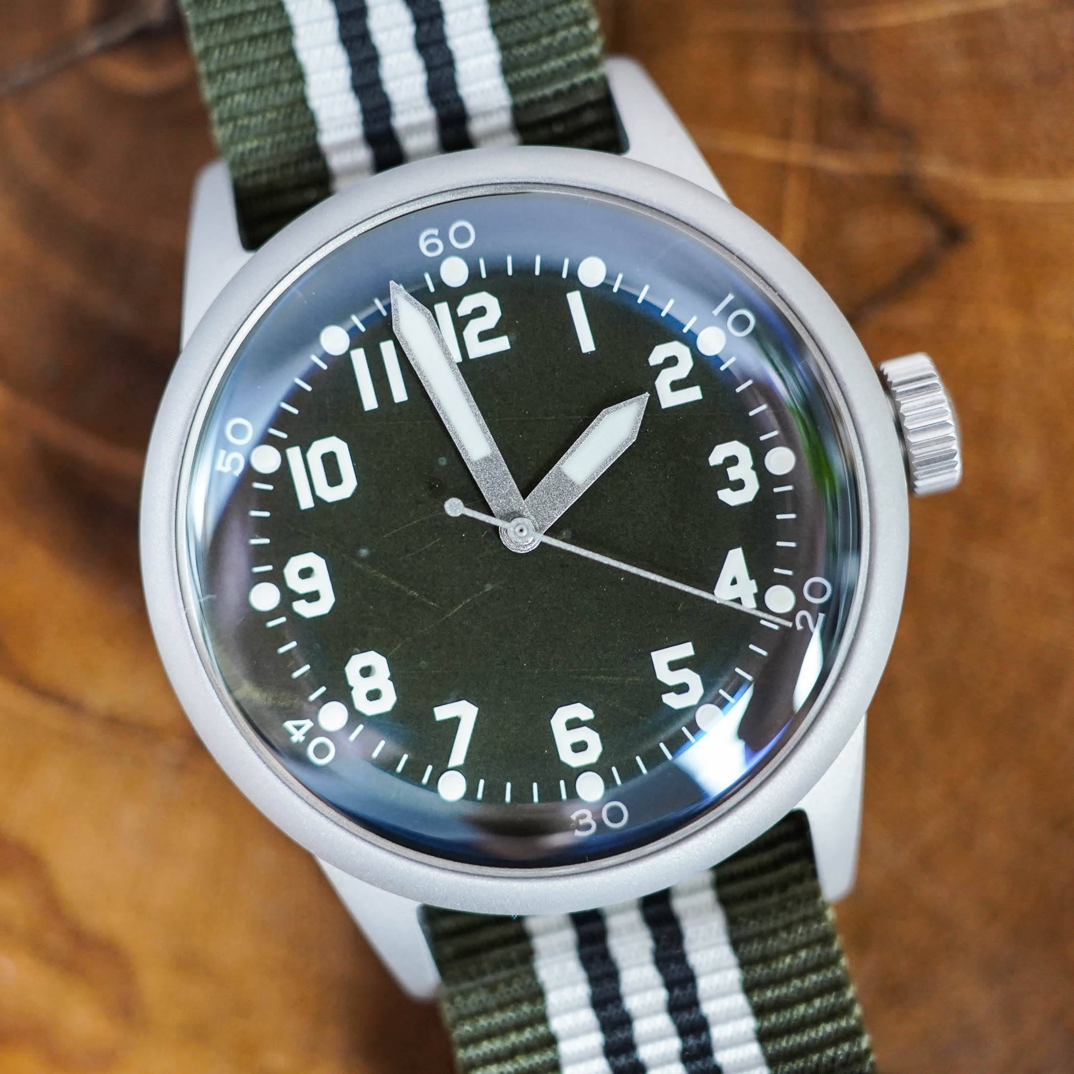 The A-11 spec was used for over 150,000 watches during the war and became the foundation for “field” watches with bold white Arabic numerals over a black dial. This watch is based on an earlier Praesidus Normandy model, the A-11 Tom Rice. Aluminium from the “hamburger” doors of a wartime C-47, located just in front of the propellors, was used for the C-47 D-DAY A-11 dials with original patina left intact. “Hamburger” refers to the fact that you’ll “become hamburger” if you open the door while the prop is turning. The dials come in three variants – raw aluminium, olive green or aluminium grey with thinned paint to reveal the underlying patina. The indices, oversized Arabic numerals and hands are painted with Super-LumiNova for maximum nighttime legibility.