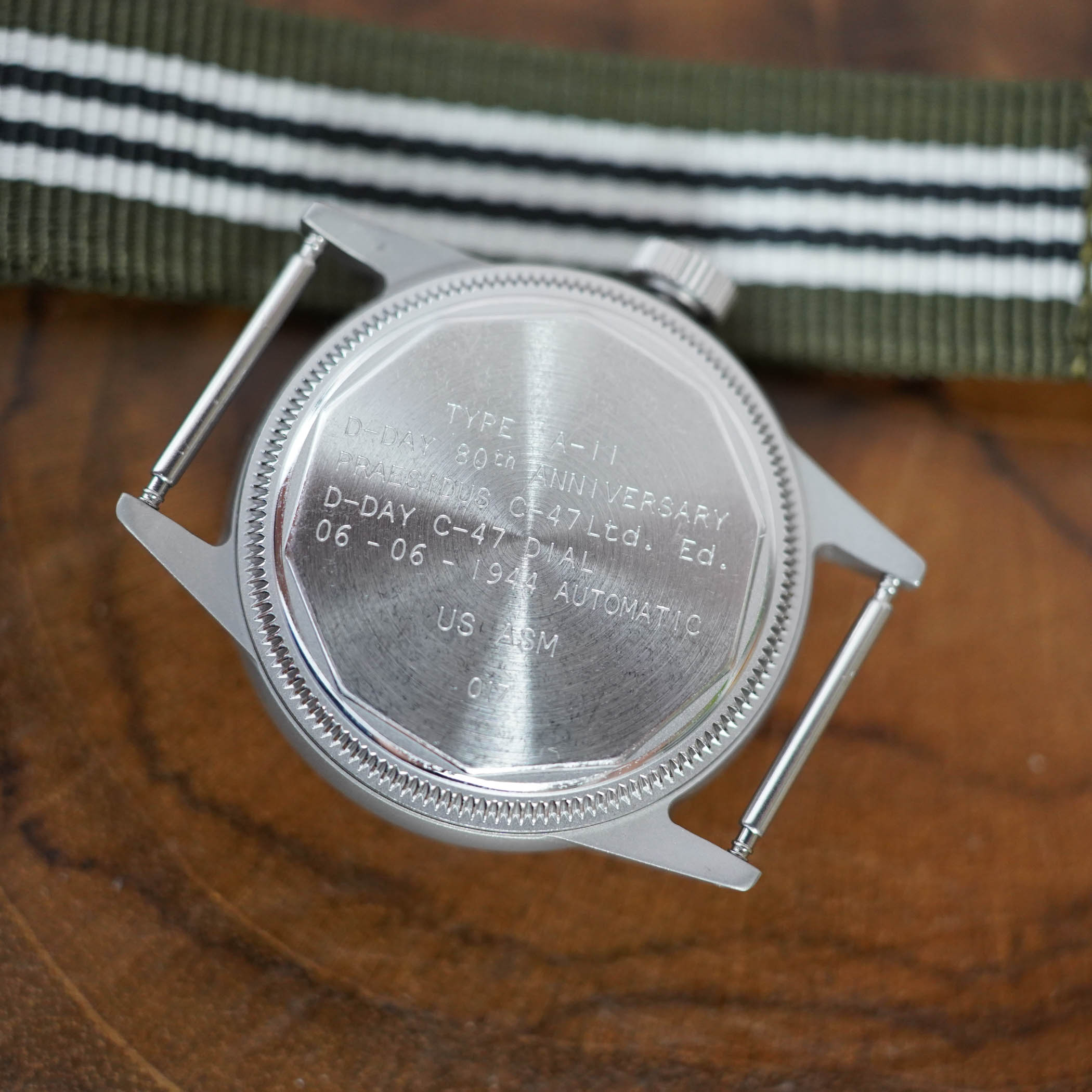 Thousands of paratroopers had landed behind enemy lines as well, many jumping from Douglas C-47 Skytrains. Developed from the civilian Douglas DC-3 airliner, the large transporters were major contributors to the allies’ success in Normandy. Combining actual aluminium from a C-47 door with the A-11 “field watch” aesthetic (produced for US military troops during World War II) brings real history to the C-47 D-DAY A-11 model.