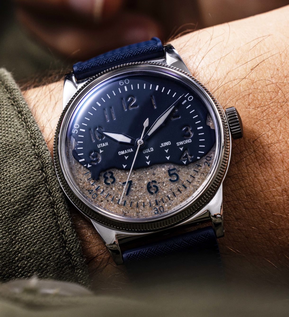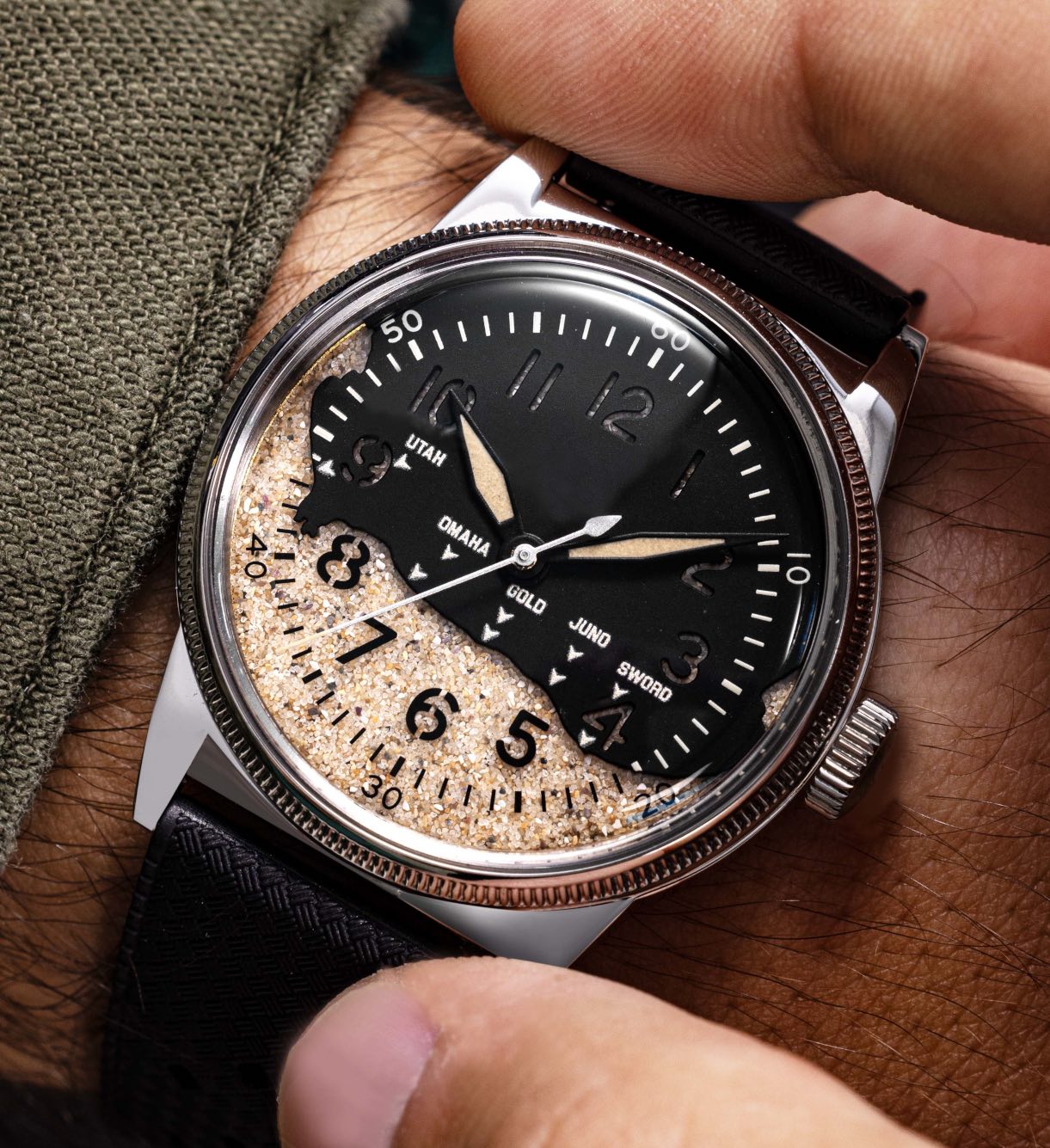 A second D-DAY watch focuses on the Normandy beaches with actual sand used within the dials. Working with the Utah Beach Landing Museum, sand from Utah Beach is covered by a thin layer of glass, while an additional layer provides a solid representation of the Normandy coastline. The Arabic numerals go from prints on glass to cutouts in the solid upper section to show the sand texture beneath. This solid portion comes in three colours – matte green, black or blue. Super-LumiNova is used on the hands and printed indices, and the seconds hand doesn’t have a counterweight, mimicking an original 1944 A-11 Waltham watch (used as a design reference) that has a broken/missing counterweight.