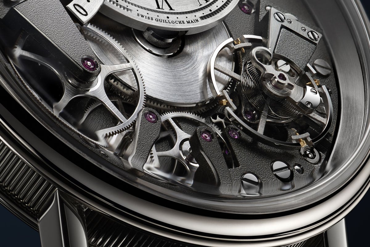 What determines the looks of all pieces from the Tradition collection, is that most parts of the mechanical movement are fully exposed on its face, and the time is displayed on a subsidiary dial by means of a blued-steel Breguet open-tipped hour and minute hand. While the movement is usually hidden beneath the dial, here Breguet reveals the bridges, wheels, escapement, barrel and other components of the movement. Everything is finished in a classical way. For instance, the peculiar, block-shaped, bridges and main plate are peened; a decorative technique that requires a faultless execution to achieve a regular and uniform finish.