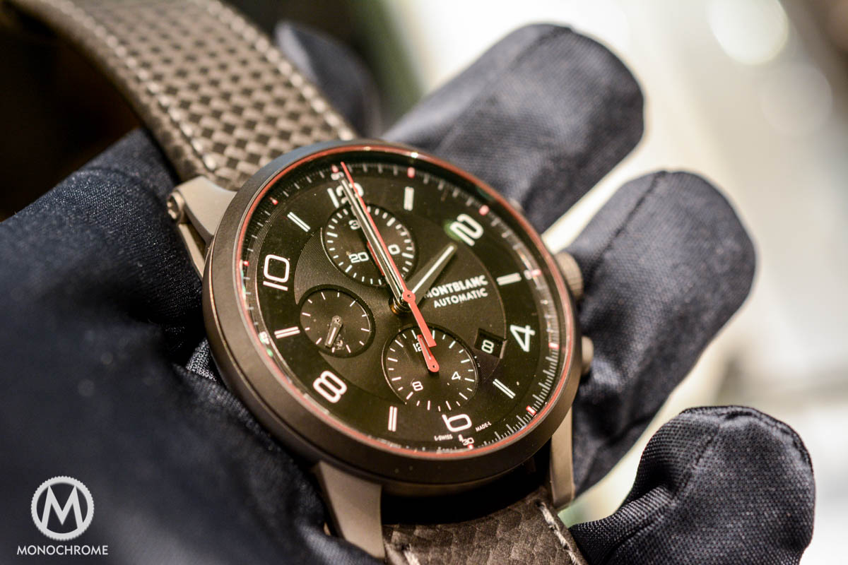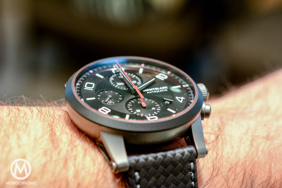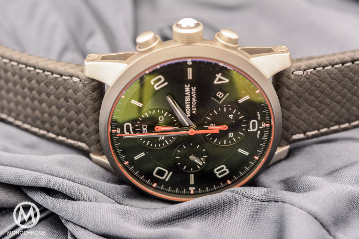 Here is the new TimeWalker Urban Speed Chronograph on the Montblanc Extreme Leather strap. The new e-Strap (more about that later) is made of the same leather, which is created by the Montblanc Pelleteria in Florence. Due to its innovative manufacturing process, the upper surface of the leather wristband has a characteristic carbon appearance. The leather is textured and simultaneously impregnated with a treatment that not only coats the surface of the wristband, but also bonds with it and increases its structural strength. This technique produces leather that is abrasion resistance, water repellent and heat-, wear-, water- and fire-resistant.