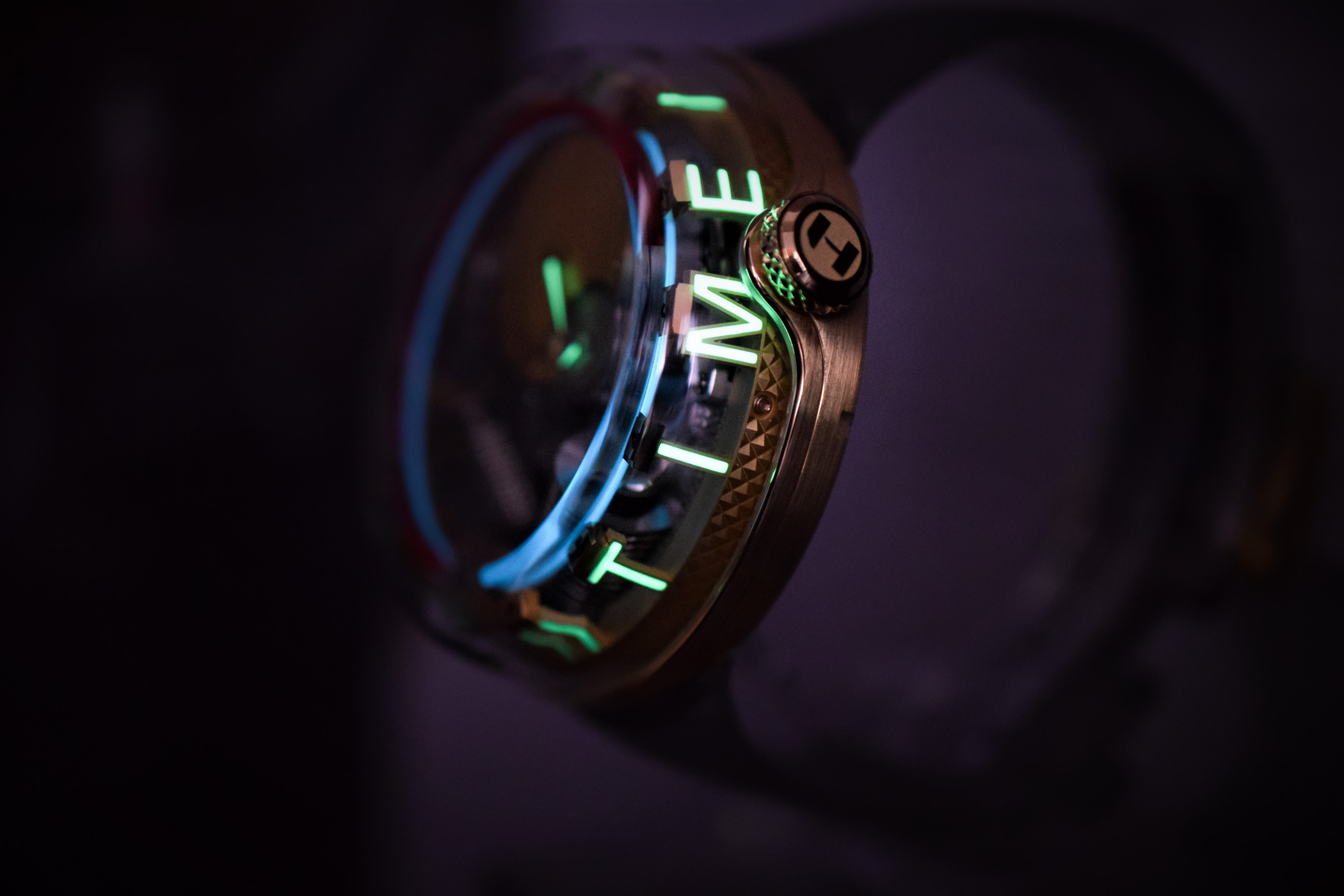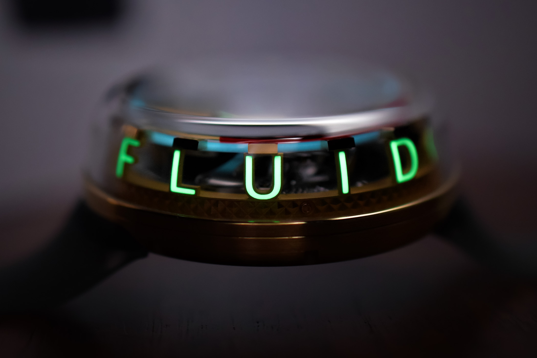 This limited edition watch carries forth the brand’s mantra, literally putting it into words (Time is fluid) that replace the hour indications on the side of the case. The letters are machined from a single metal ring and filled with luminescent material to glow in the dark.