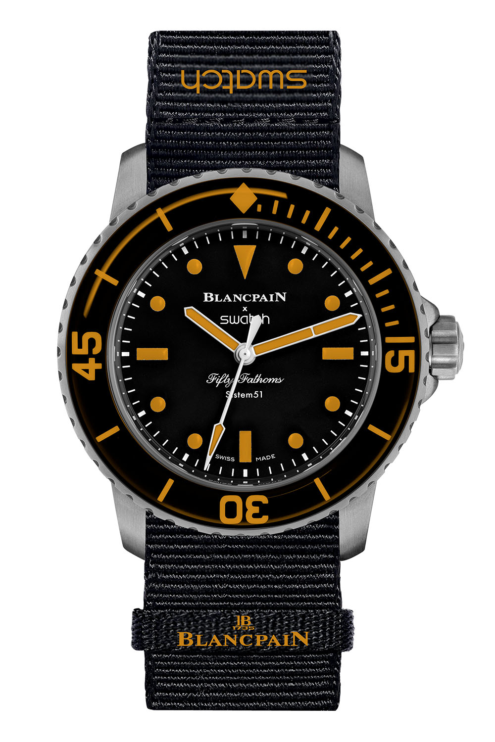 Because you’re reading MONOCHROME, and you know our passion for mechanical watches, we’ve decided to give this Swatch x Blancpain Fifty-One Fathoms something a bit more refined, with an automatic Sistem51 movement inside. Composed of only 51 parts, this self-winding entry-level calibre has made it possible to offer mechanical power at an accessible price, thanks to several clever elements in its architecture, assembly and conception. You can read all the details about this movement here.