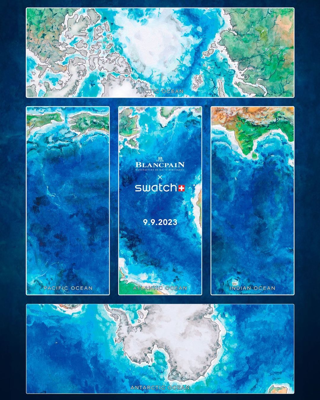 Above are the teasers released by Swatch and Blancpain. The first one reveals the date – 9 September 2023 – as well as the aquatic theme, and the shape of the crown that is, without a doubt, that of a Blancpain Fifty Fathoms. The second teaser, which was posted yesterday on both Swatch and Blancpain’s Instagram pages, not only confirmed the parties to be involved in this new collaboration, which follows the Swatch x Omega Moonswatch, but it could also reveal the name of future editions. In the same vein as the Moonswatch editions based on the Solar System’s planets, the Swatch x Blancpain Fifty Fathoms watches could well be inspired and named after our oceans – Arctic Ocean, Pacific Ocean, Atlantic Ocean, Indian Ocean and Antarctic Ocean. But then again, these are guesses based on a teaser and the reality will only be confirmed this coming Saturday.