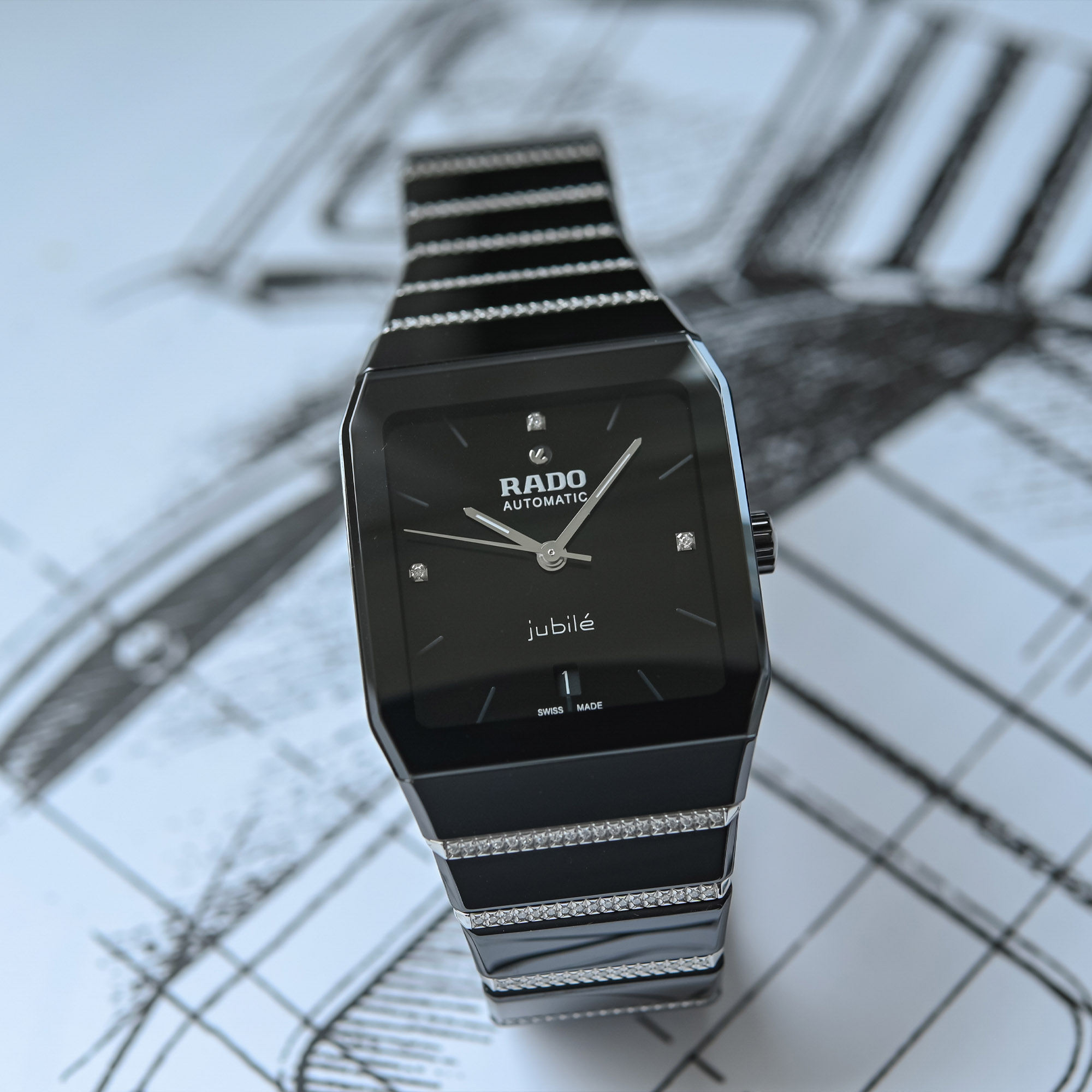 The black high-tech ceramic reference with steel links retails for EUR 4,950, and the same model with yellow gold-coloured links for EUR 5,050. The grey high-tech ceramic model retails for EUR 5,050. The Jublié model with 165 diamonds retails for EUR 9,900, while the black Jubilé model with three diamonds on the dial costs EUR 5,050. More information at rado.com.