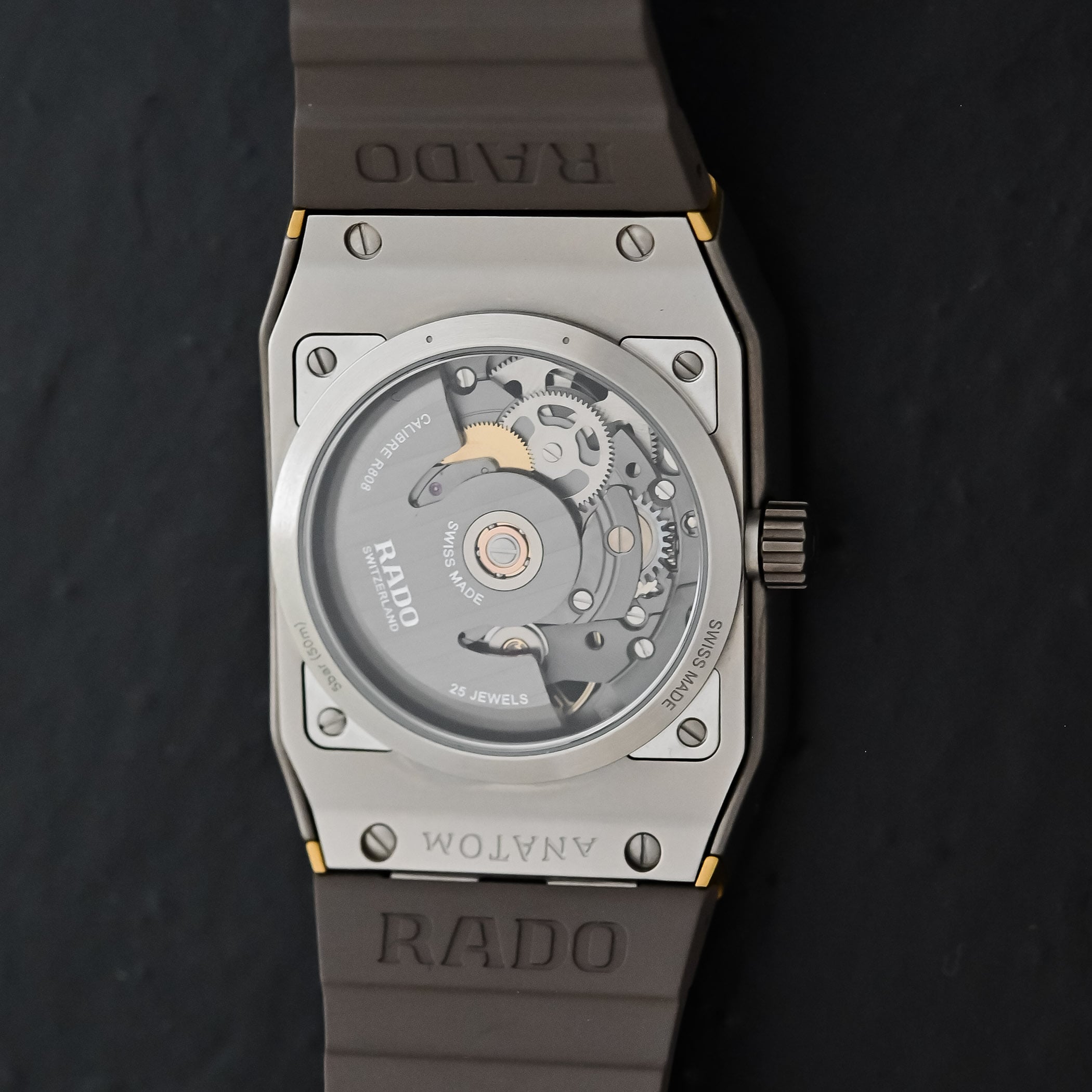 A round sapphire glass on the caseback exposes the large anchor-shaped rotor of calibre R808, decorated with Côtes de Genève. Delivering a robust 80-hour power reserve, Rado’s R808 automatic movement is fitted with a Nivachron hairspring that is unaffected by magnetic fields and temperature fluctuation.