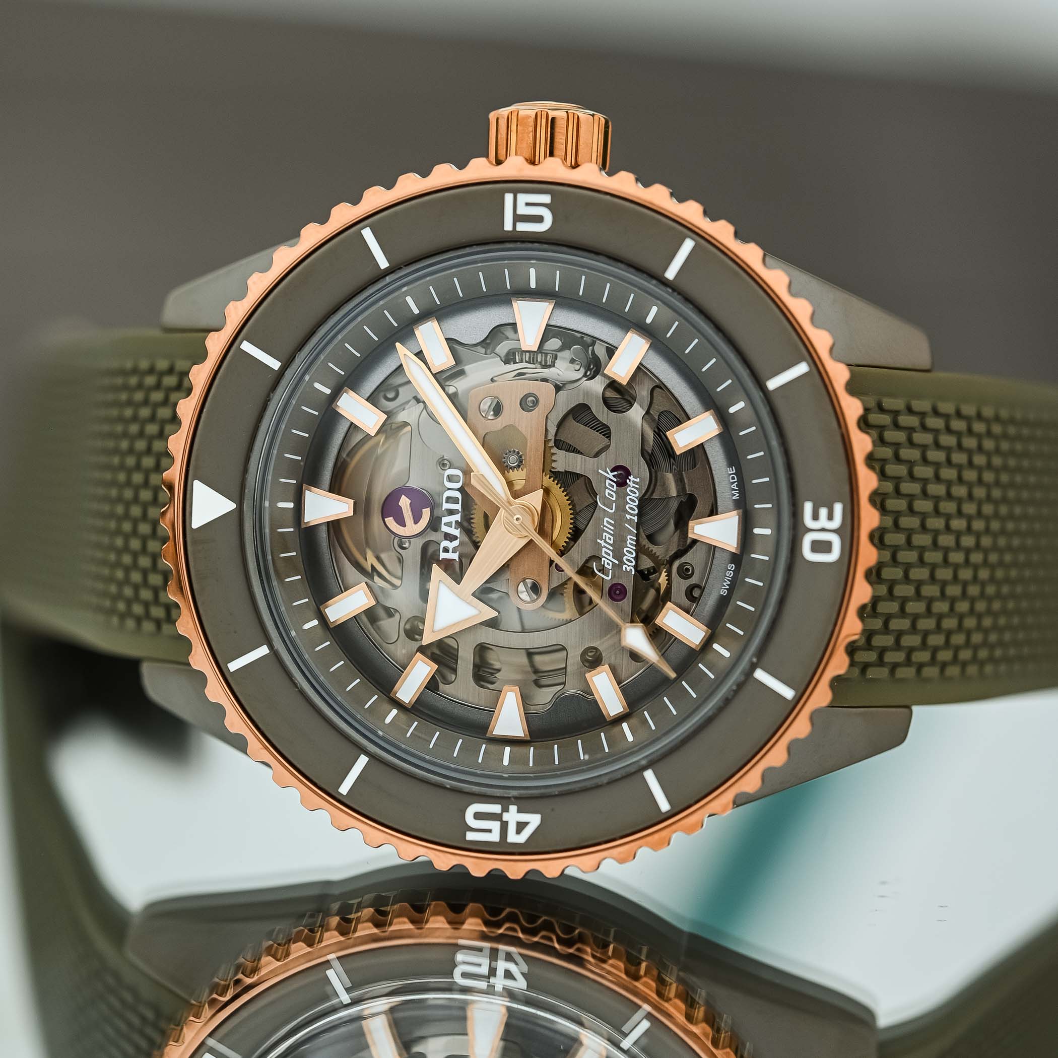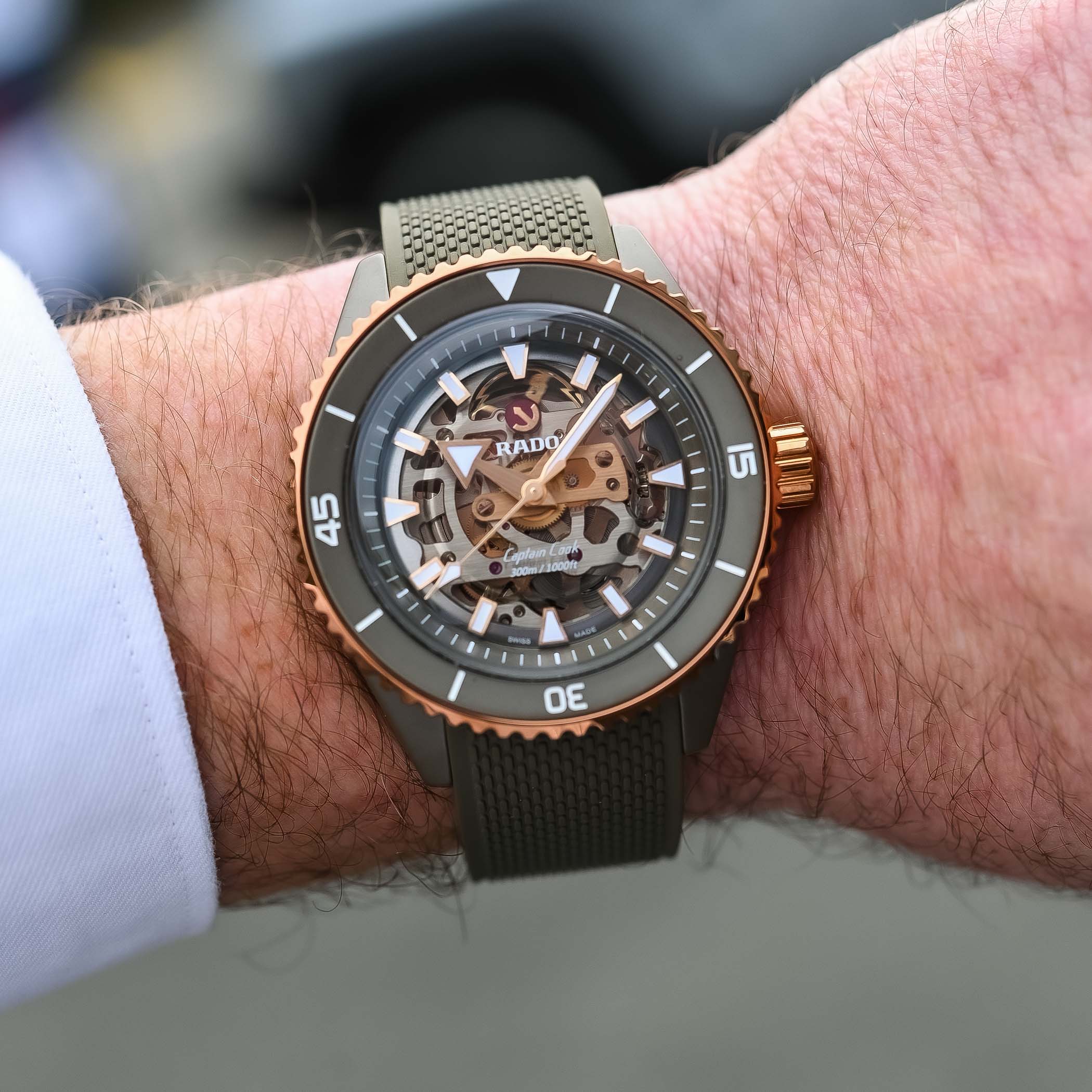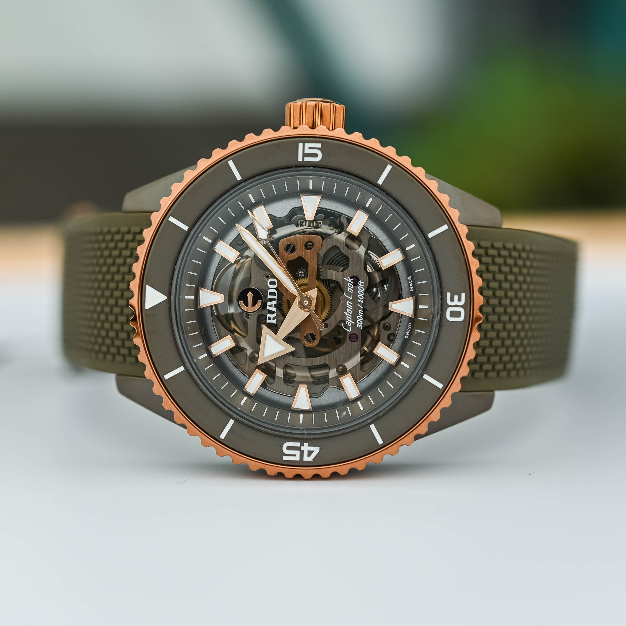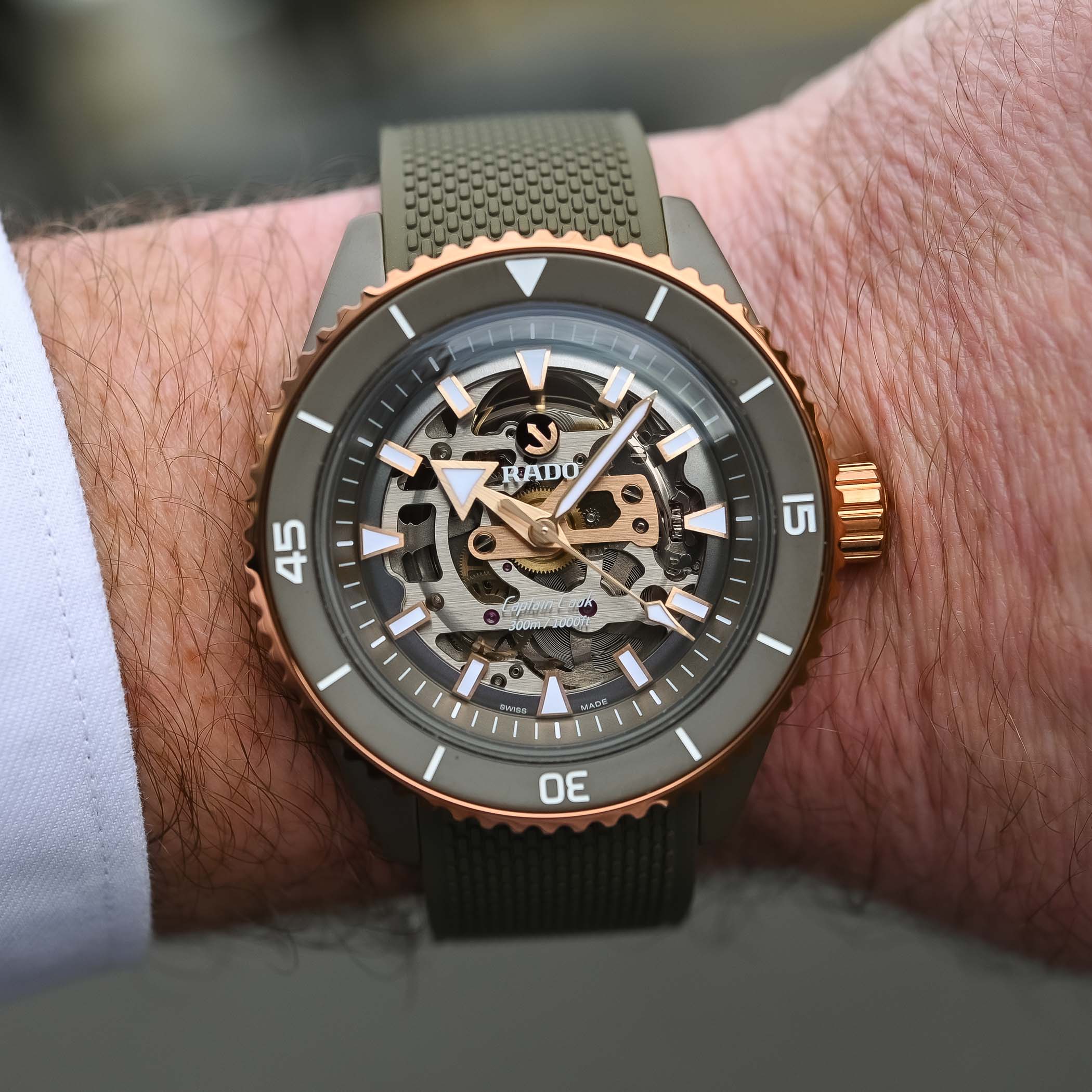 With its Captain Cook, Rado, a brand part of the Swatch Group, is merging two important sides of its history. First, this watch collection revived one of the brand’s greatest watches of the past, a 1960s dive watch with a rather peculiar yet attractive design. Second, it is used as a vessel to showcase the company’s leading know-how in high-tech materials (the brand labels itself as The Master of Materials), in particular ceramics. This skilful blend of retro vibes and high-tech materials has recently been demonstrated with the Captain Cook High-Tech Ceramic Skeleton, which is now available in an unexpectedly cool mix of olive-green ceramic and PVD rose gold accents.
