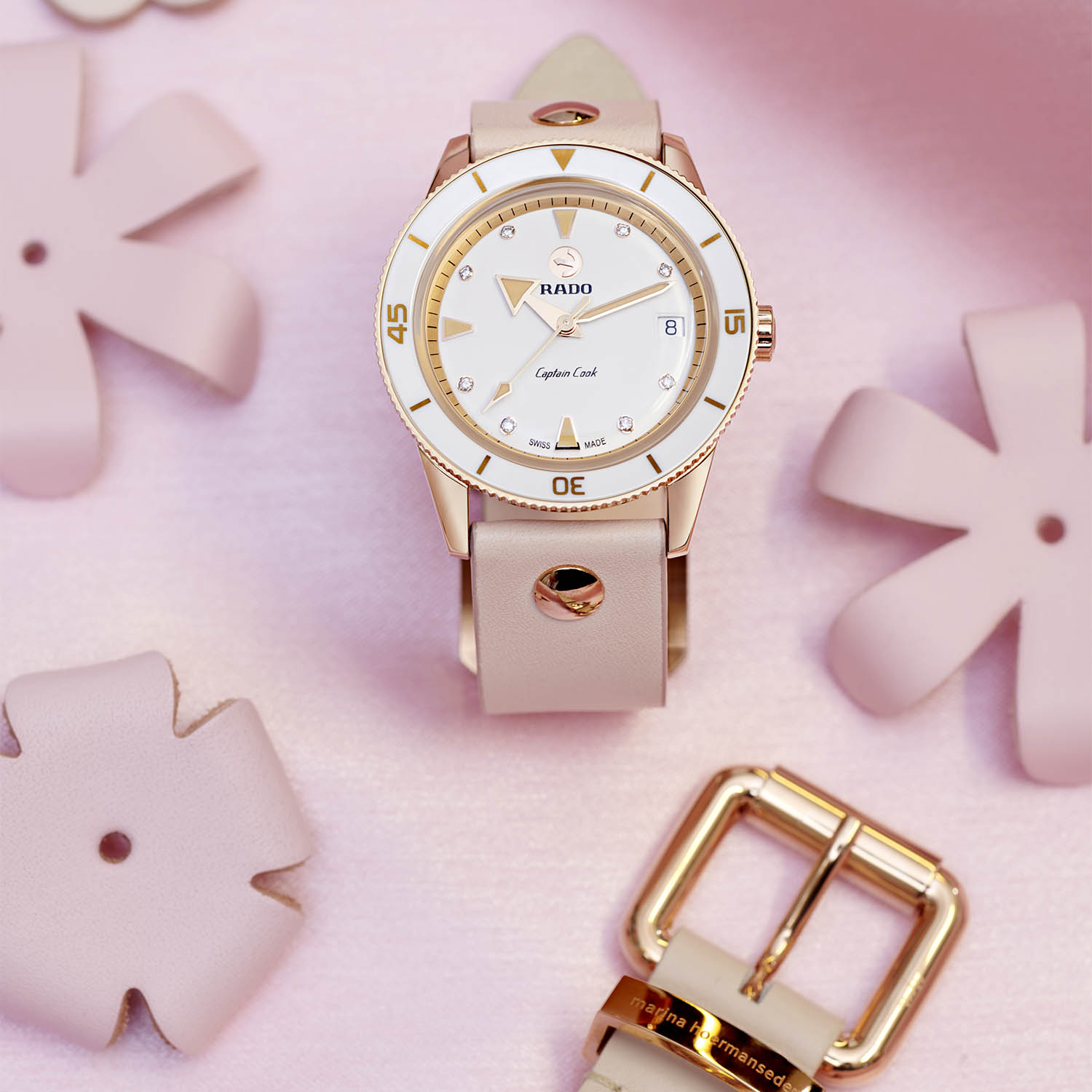 Another obsession of Marina Hoermanseder has to do with her preference for leather and large buckles. According to the designer, buckles add “a tough and bold look around the wrist” to contrast with the more feminine rose gold colour scheme. In Hoermanseder’s words: “A challenge was to make the Rado Captain Cook x Marina Hoermanseder very feminine. This is why we chose soft colours and rose gold. Designing this Captain Cook edition, we wanted to give it a bold touch as well as a very soft and feminine one. This is what I always want with my fashion, to give women a spine, self-esteem and power. I think this watch includes all of these elements because it is in soft colours, it comes bold with the buckle, and it is not a small watch; it is quite a bold piece but combined with those colours, it’s feminine and timeless.”