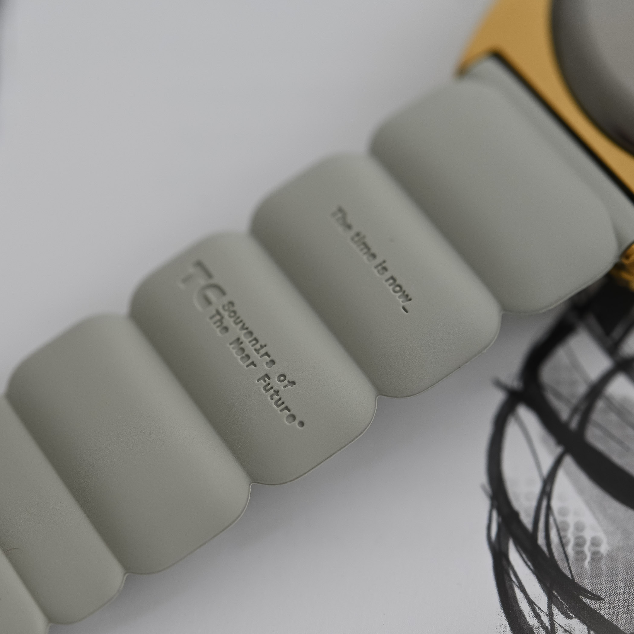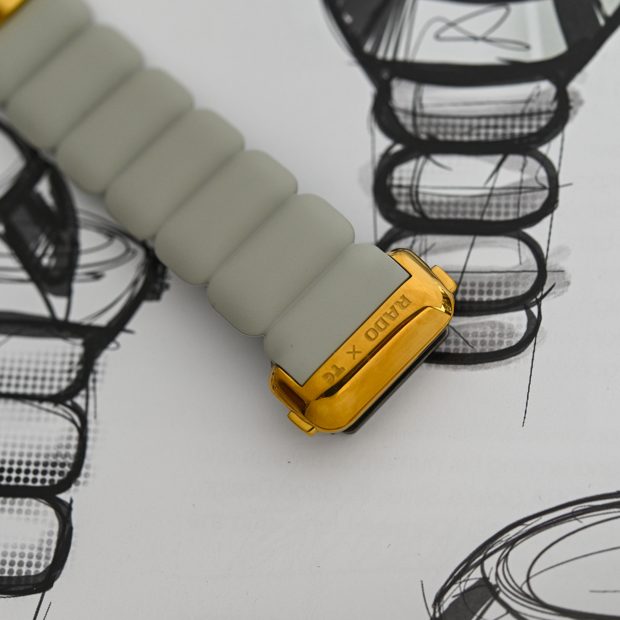 The Rado DiaStar Original x Tej Chauhan is worn on a highly original and unconventional grey pillow-shaped rubber strap. Its reverse side reveals the captions: “The time is now” and “TC Souvenirs of The Near Future”. It is secured to the wrist by a PVD-coated steel extendable folding clasp that can be opened by a pair of pushers. The price is set at CHF 2,150 – more details at Rado.com.