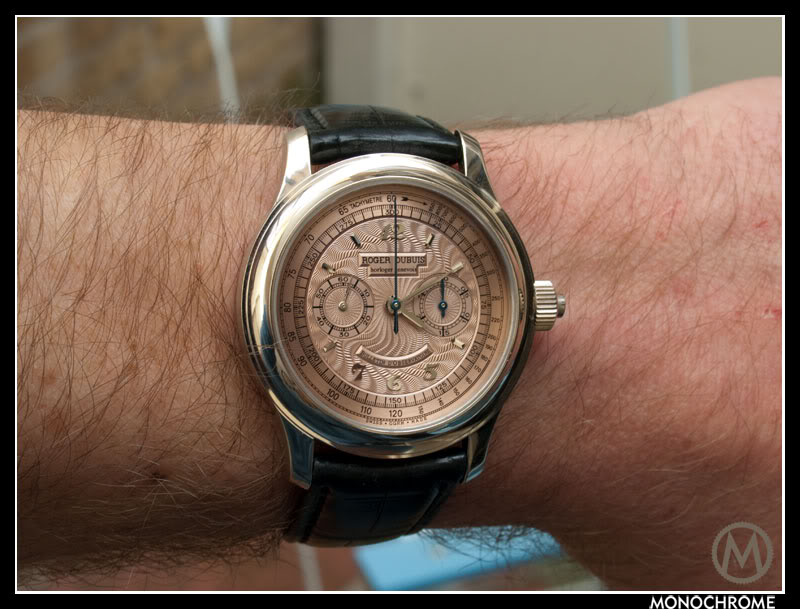 Recently a friend mailed me about a watch that was for sale at a local watch store. He knoww I have a weak spot for mono-poussoir chronographs. The watch was a Roger Dubuis Hommage Mono-poussoir in white gold with a salmon color dial. A salmon color dial is not my usual pick, but this one was so beautiful….