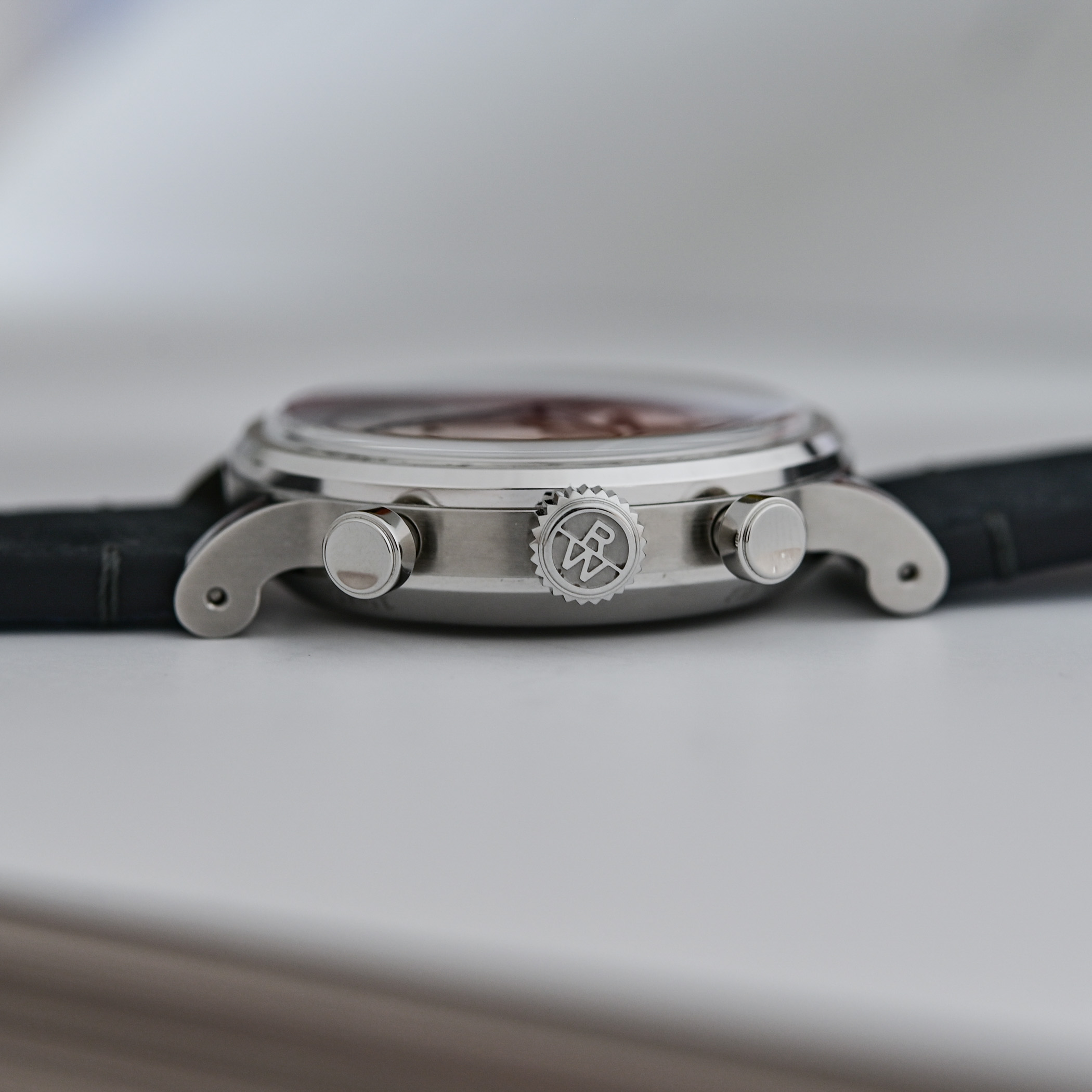 The most exciting news is undoubtedly the Valjoux calibre 23-6 powering the watch, an evolution of the classic Valjoux 23. The movement inside The Fifty was produced in 1976, the same year as the brand’s foundation. Completely restored and hand-decorated, the vintage chronograph with classic architecture – column wheel and horizontal clutch – operates at 21,600 vibrations/hour, delivers a 40-hour power reserve and can be admired through the caseback. The bridges and balance cock are decorated with Côtes de Genève and treated in black ruthenium, contrasting vividly with the blued screws. The anglage is executed by hand, as are the sinks surrounding the screws, and you can clearly pick out the nine columns of the wheel.