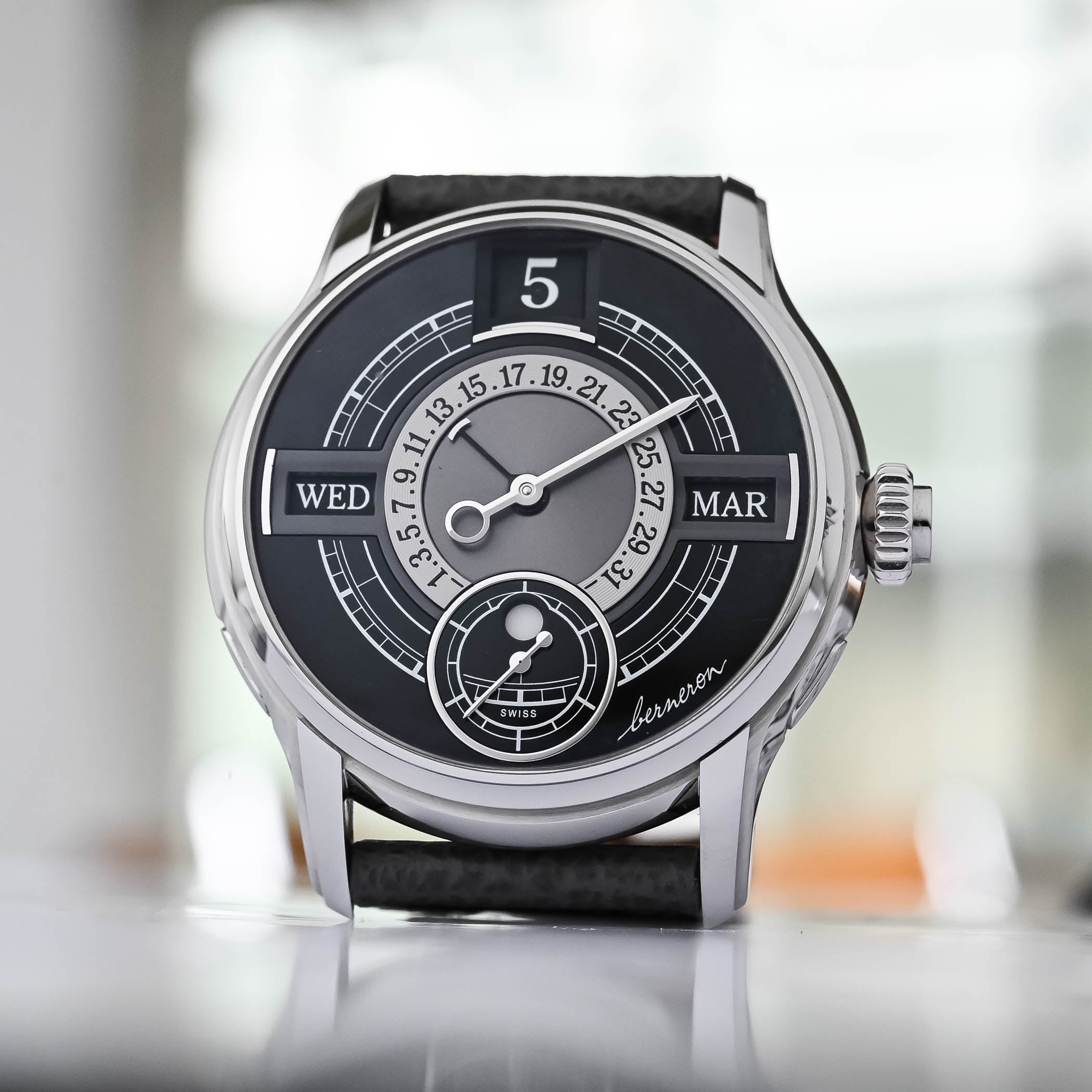 Another reputed indie brand founded by Rémi Maillat, Krayon gives complications an ingenious, often unexpected twist. Described as a “mechanical agenda”, Krayon’s 39mm white gold Anyday belies its complexity. At first glance, it could be mistaken for a straightforward pointer date with a 1-31 date scale on the perimeter, indicated by a crescent-shaped pointer, with time displayed conventionally with central hour and minute hands. However, suppose you want to know which day of the week the 10th falls on? Well, Anyday has the answer. The days of the week are displayed in navy blue, while Saturdays and Sundays are transparent. Sounds simple, but the mechanics are decidedly complex. A captivating model inside and out, you can baffle admirers with this never-before-seen complication.