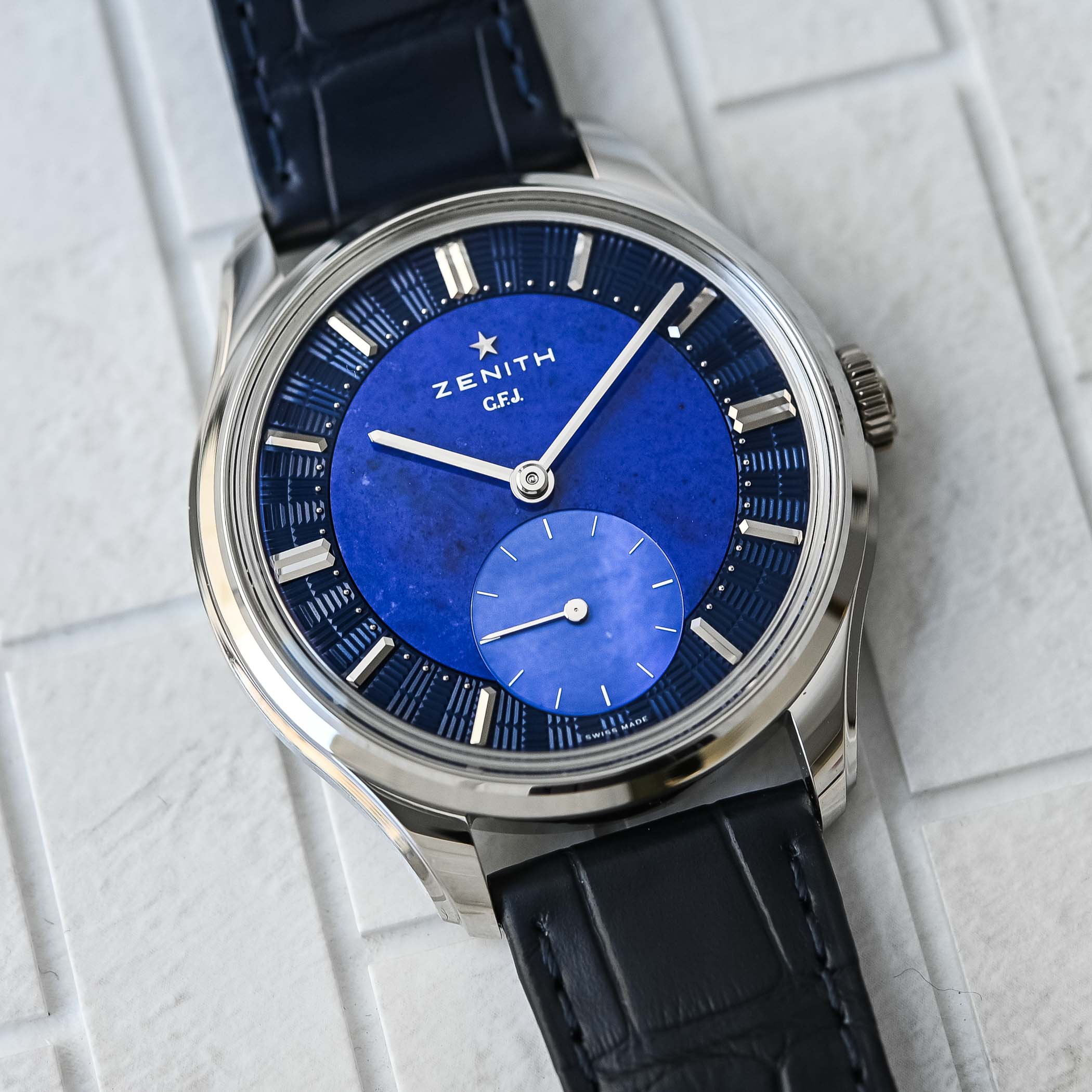 Last, but certainly not least, is the Zenith GFJ. Made to celebrate 160 years of watchmaking by Zenith, it is also a celebration of the legendary Calibre 135 and chronometric competition. We’re glad Zenith didn’t just do a remake of the original from more than half a century ago but opted for a unique Bricks guilloche decoration with Lapis Lazuli and blue Mother-of-Pearl elements. The movement has also been upgraded and decorated, and although this might not come to mind when thinking of dress watches, we think it fits the brief!