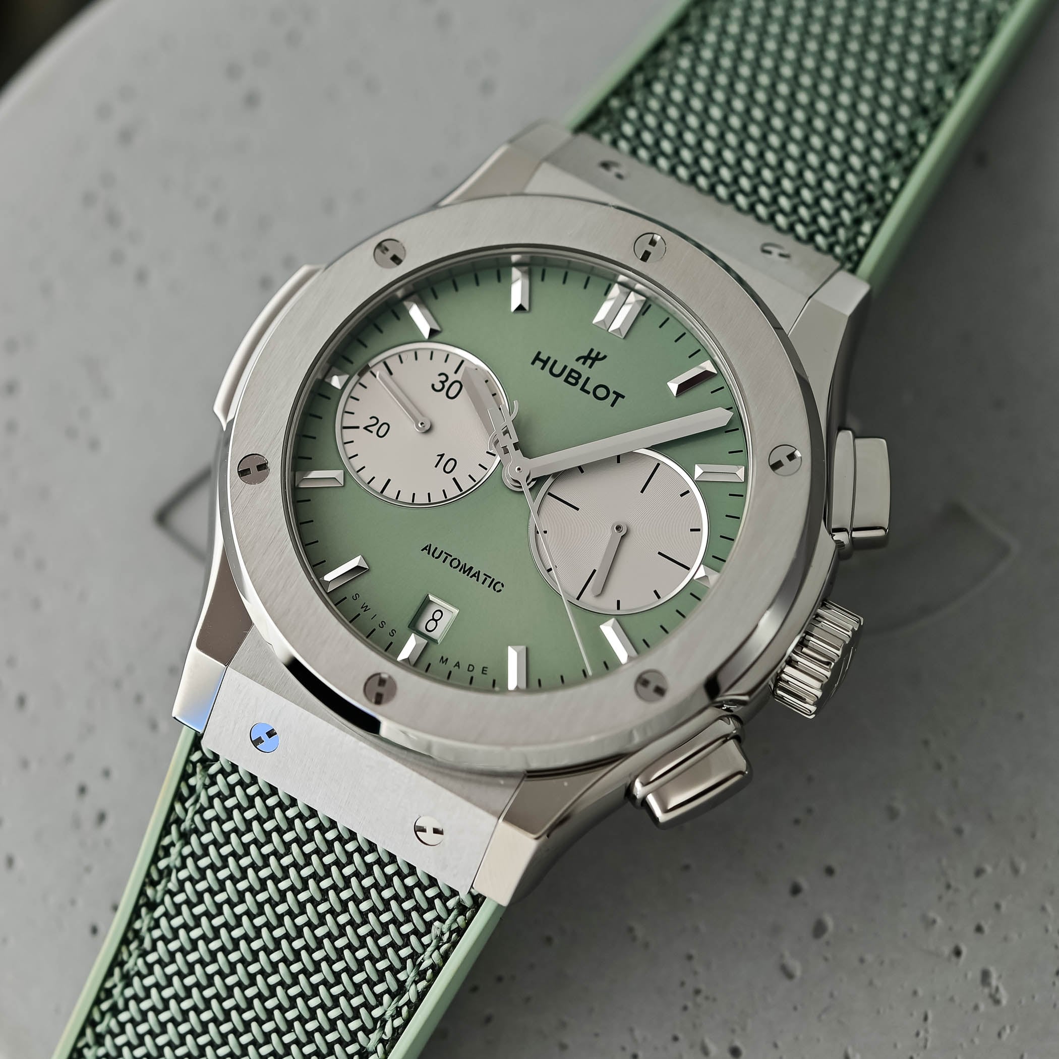 Hublot presented a whole range of new Big Bang iterations, but the finest, to us at least, is the new Classic Fusion Chronograph in Sage Green. At 45mm in diameter, it’s not a subtle watch by size, but it’s toned down a touch with a lovely soft green colour on the dial and strap. Along with contrasting subdials, polished hands and markers, it makes for a very sleek and stylish chrono. The titanium case also keeps things nice and light, so it’s a comfortable wrist-companion. The integrated sage green rubber/fabric hybrid strap has a woven-texture insert and is fitted to a folding clasp. The price is set at EUR 12,200 incl. VAT.