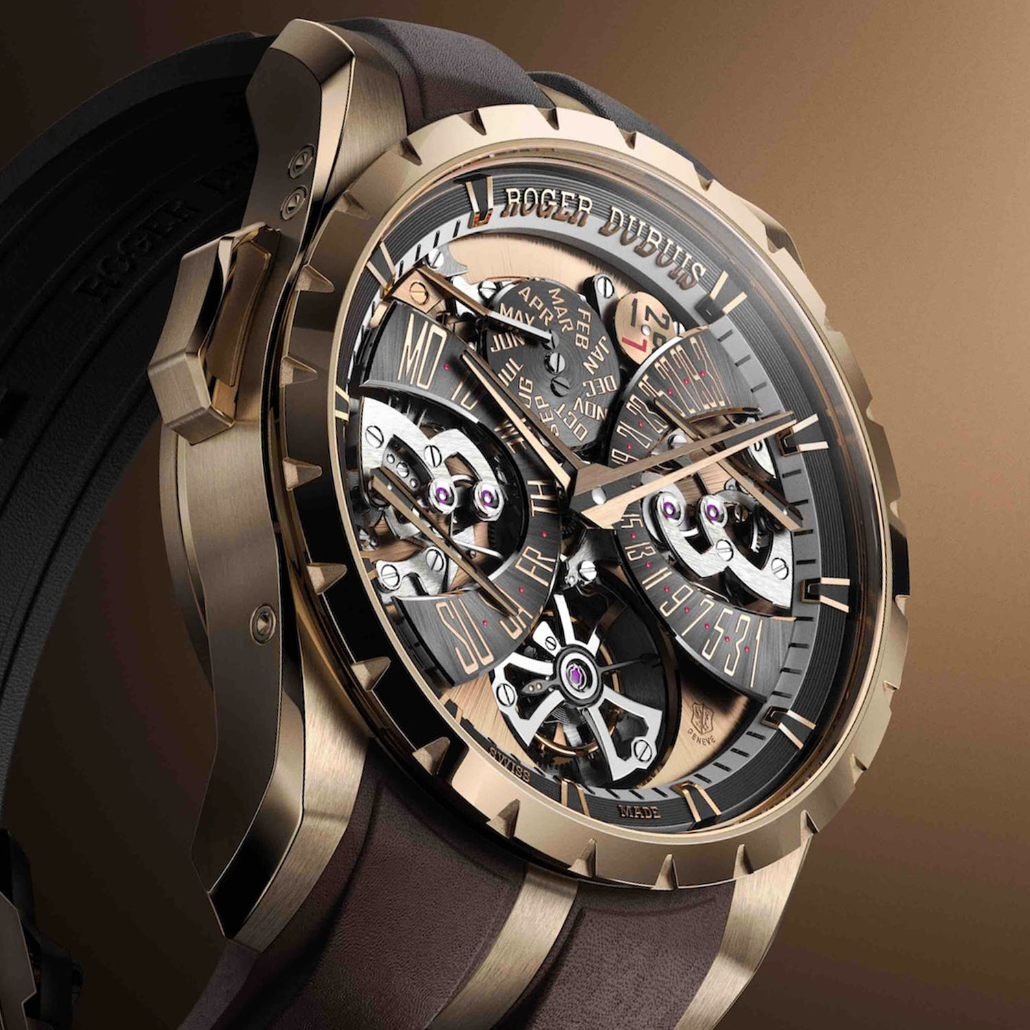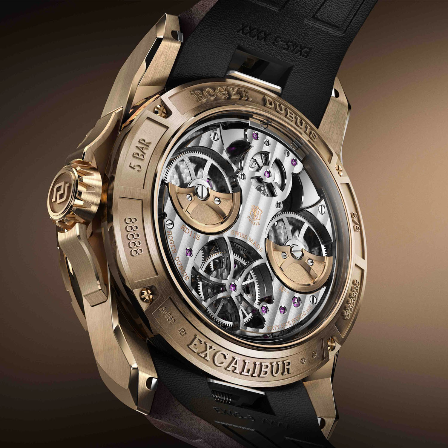 Another milestone watch, marking 30 years of watchmaking under the Roger Dubuis name, is the new Grande Complication. Set in the extravagant Excalibur case, it reveals most of its technicalities on the dial side. The in-house Calibre RD118 is constructed out of 684 components and integrates a minute repeater, perpetual calendar, and flying tourbillon escapement. Energy is provided by not one, but two micro-rotors and everything is finished to the ultra-high standards of the Poinçon de Genève hallmark.