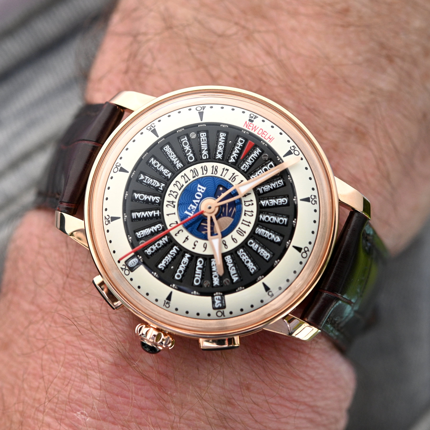 The phrase “having the world in the palm of your hand” has never been more fitting to a watch than with the Bovet Recital 30 World Timer. Well, apart from the fact it’s on your wrist, obviously. Anyway, the Récital 30 World Timer is an evolution of Bovet’s wonderful Récital 28 Prowess 1 and looks simpler in execution but relies on the same complex mechanical principle. A series of 24 rollers and a pusher in the caseband lets you adjust the World Timer display in accordance with all four annual UTC periods, including DST jumps and irregularities such as New Delhi’s 30-minute offset. If set correctly, it will tell accurate time all year round!