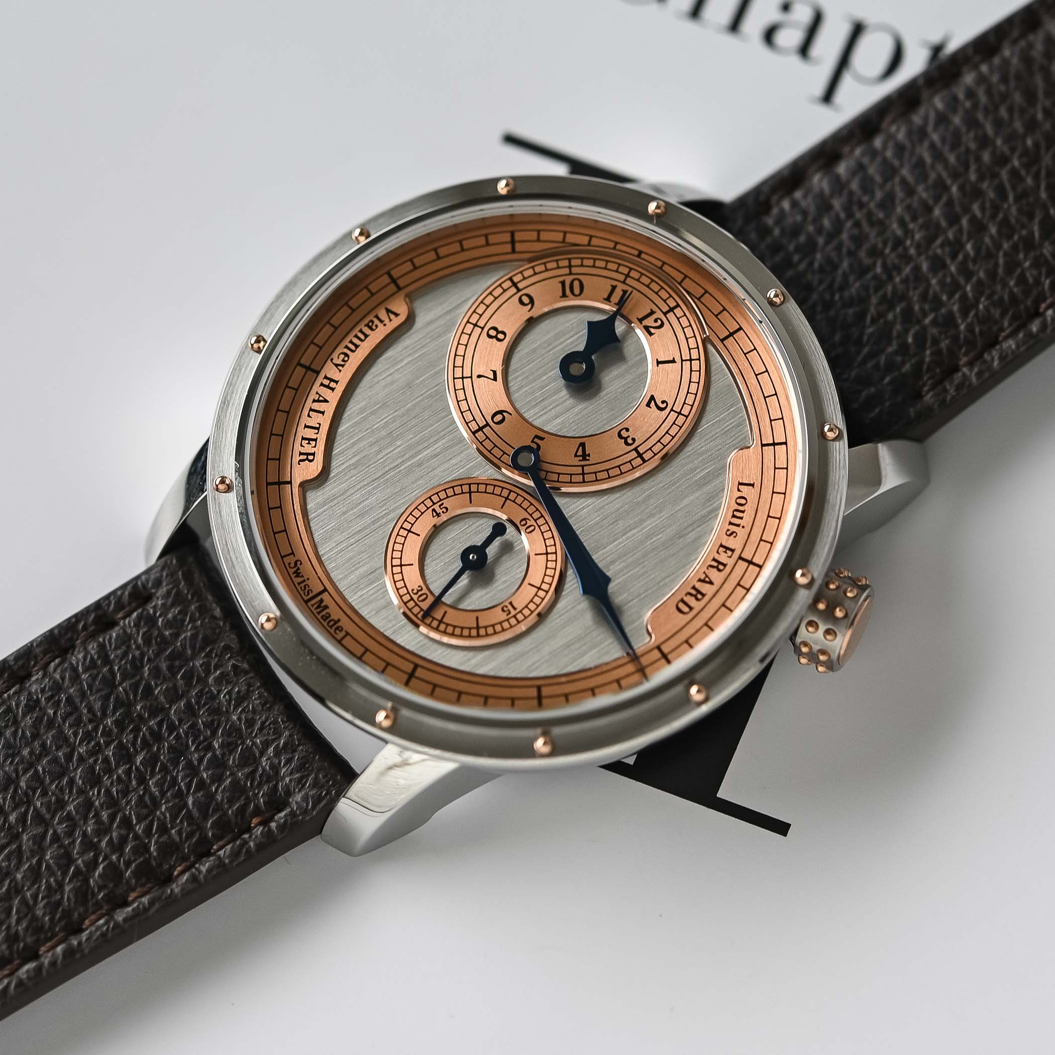 The dial, shielded by a sapphire crystal with anti-reflective coating on both sides, maintains the regulator-style layout that’s dear to Louis Erard – minutes are displayed by a central hand, while hours and running seconds occupy separate subdials. However, this collaborative edition introduces a literal twist infused with Barnes x Halter’s distinctive style. The usual horizontal alignment of the indications is tilted to the left, sending the hour subdial in the same direction and the running seconds tilted in the opposite.