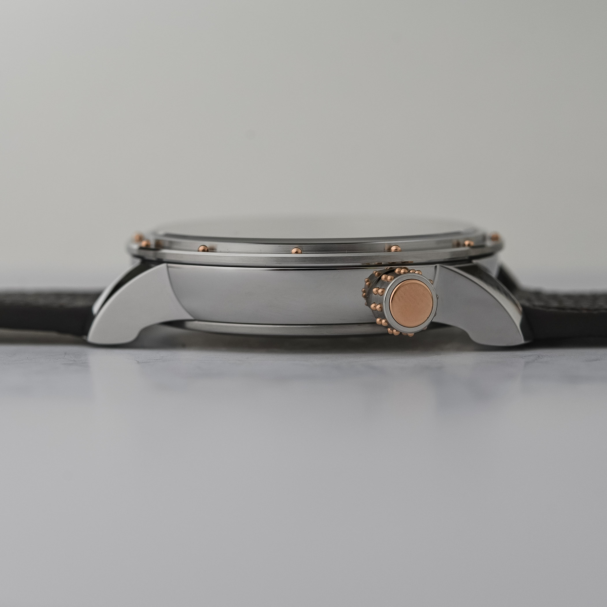 The subdials feature circular satin-brushed rings with black markings, each noticeably different in size. This creates a fleeting illusion of disarray – an effect that fades yet reappears with every glance. At the dial’s periphery, the minutes chapter ring stands out with its bulging plaque-like segments, carrying the Louis Erard logo at 2 o’clock. Like the subdials, it sports a circular brushed finish and black transfers. All these rings are cut-outs layered over a base with a refined vertical satin-brushed finish, adding depth and texture.