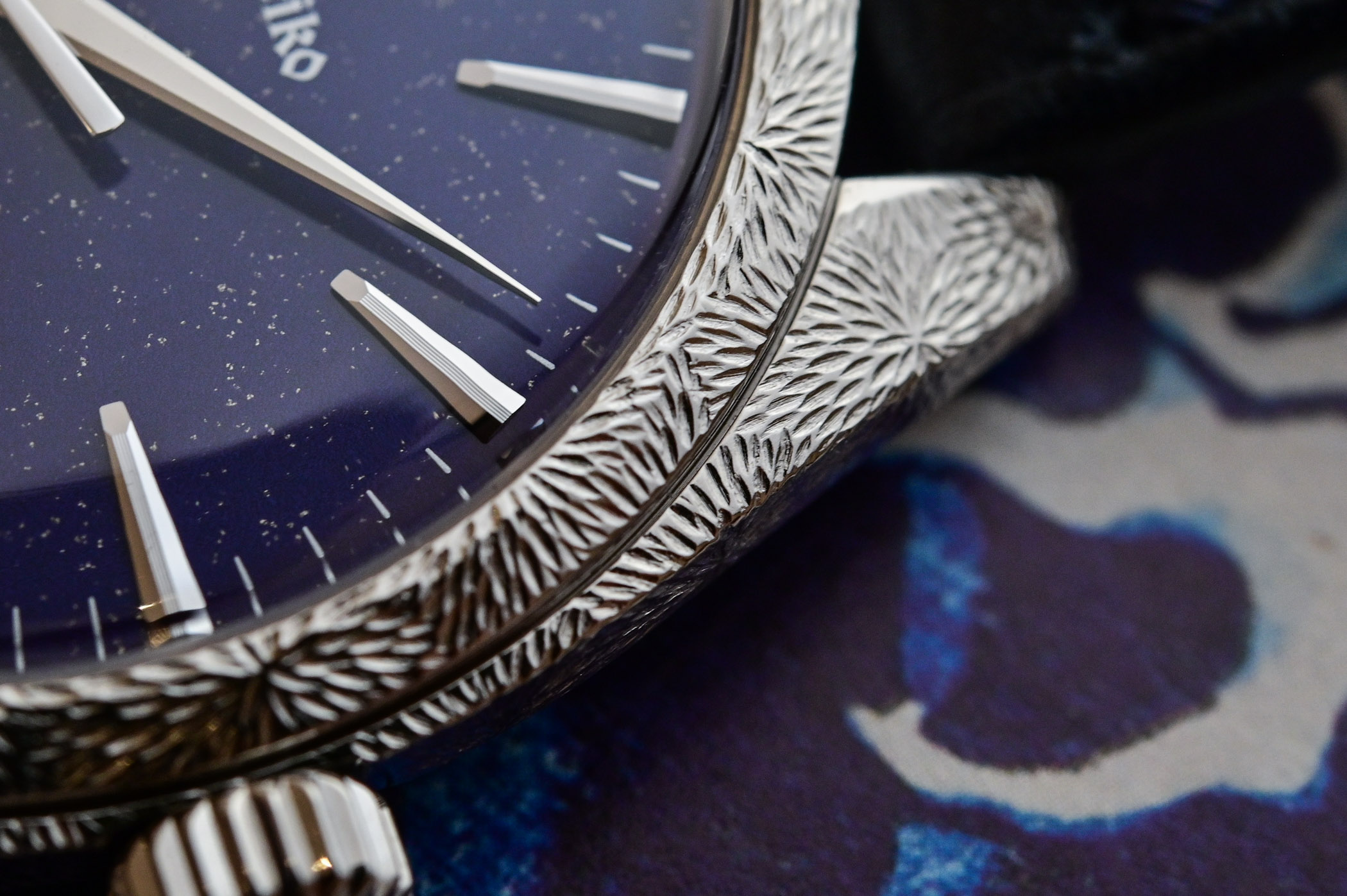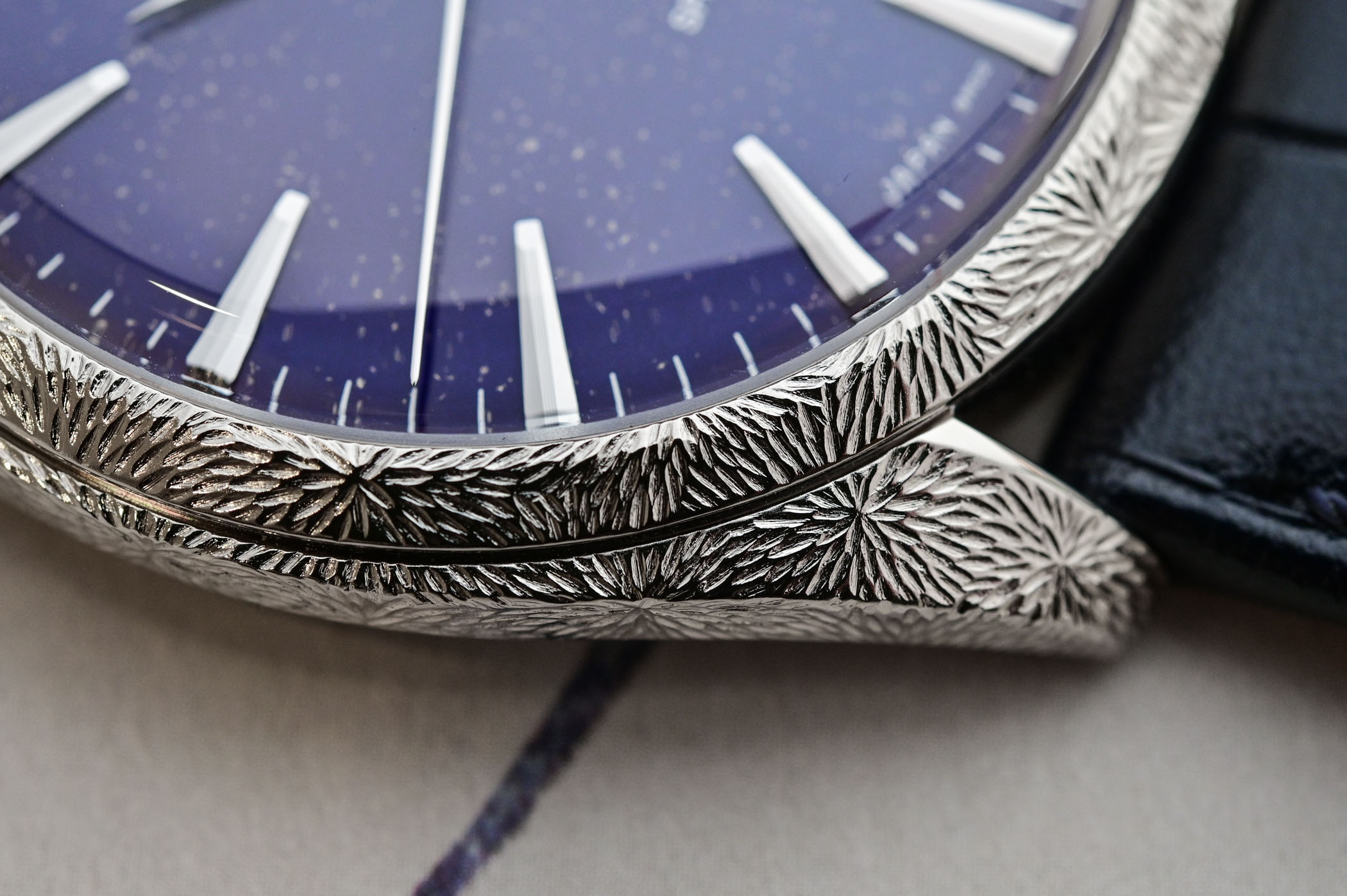 Masatoshi Moteki – The inspiration behind the design of the dial and case is the starry night sky above Achi. We tried to recreate this image on a blue dial, which is also known as Grand Seiko’s colour. The design concept dates back to the 8-day power reserve Masterpiece watch – note: the SBGD202 – which also expresses stars at night. Based on the design process established with this black dial, we wanted to adapt this to a blue dial. The first trials had a different blue colour and less sparkling qualities than the one found in the SBGZ007. Originally, we were considering giving the GS logo a dimensional feel, but we decided to have this logo etched onto the dial, which makes this process even more complicated.