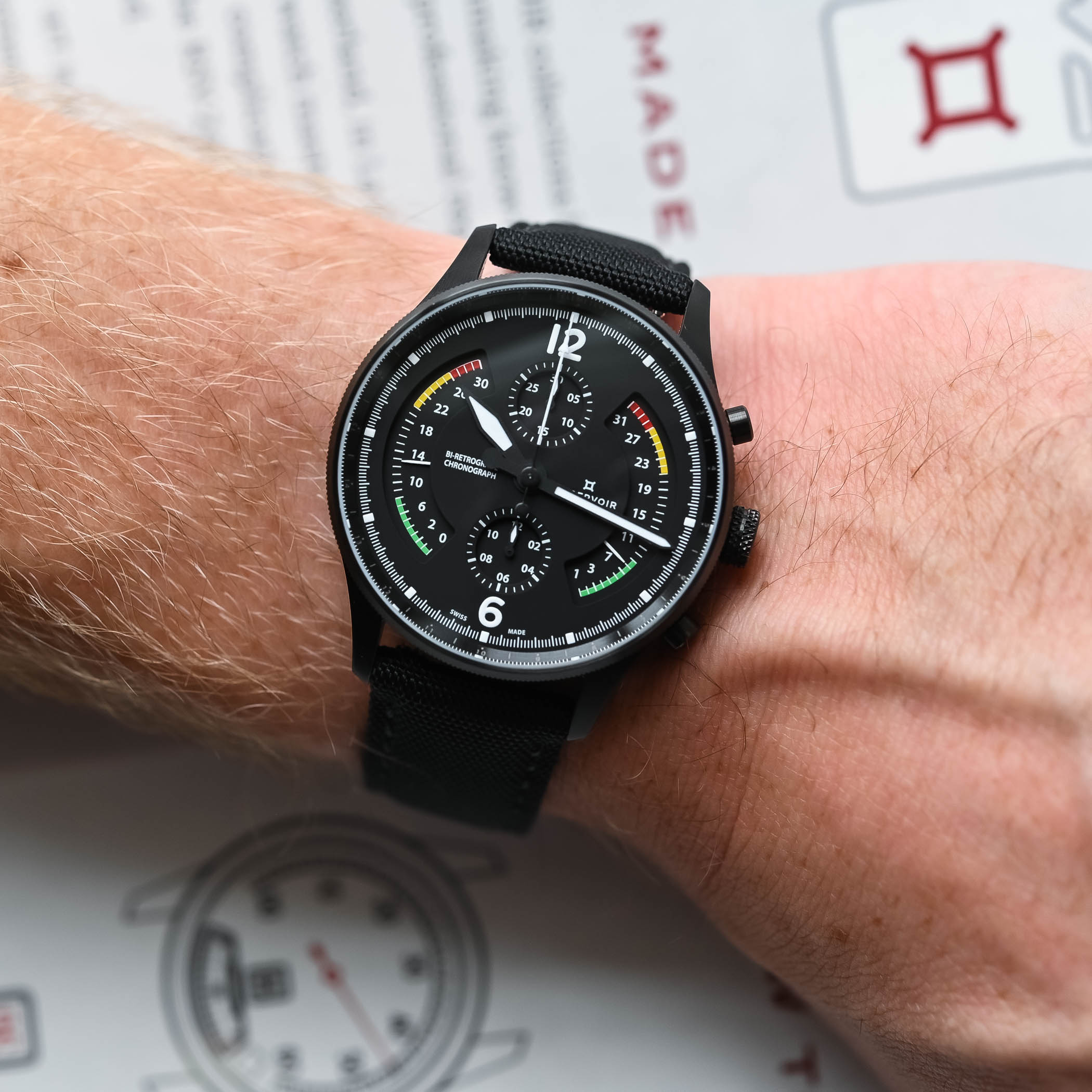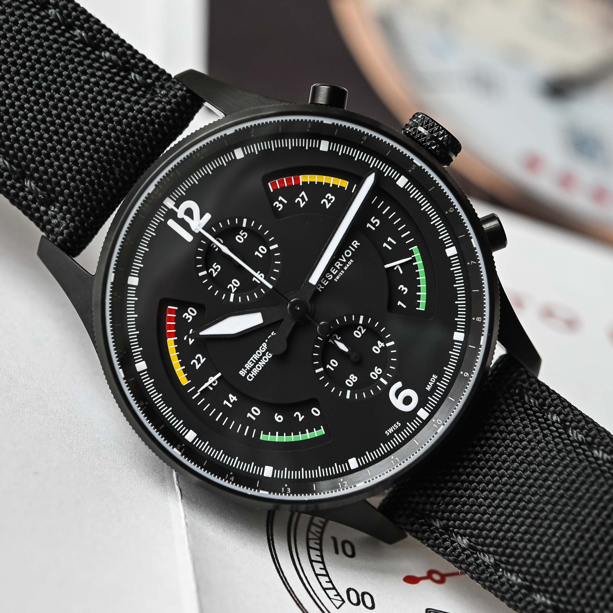 Powering the watch is Reservoir’s RSV-Bi120 Calibre, an automatic winding bi-retrograde chronograph equipped with a column wheel (an LJP-L1C0 base movement by La Joux-Perret). This movement offers a 60-hour power reserve and can be viewed through the transparent caseback. The watch comes fitted with a black canvas and leather strap, secured by a black PVD folding clasp. Notably, the strap features quick-release spring bars for easy changes, and the purchase includes an additional NATO strap, enhancing its versatility.