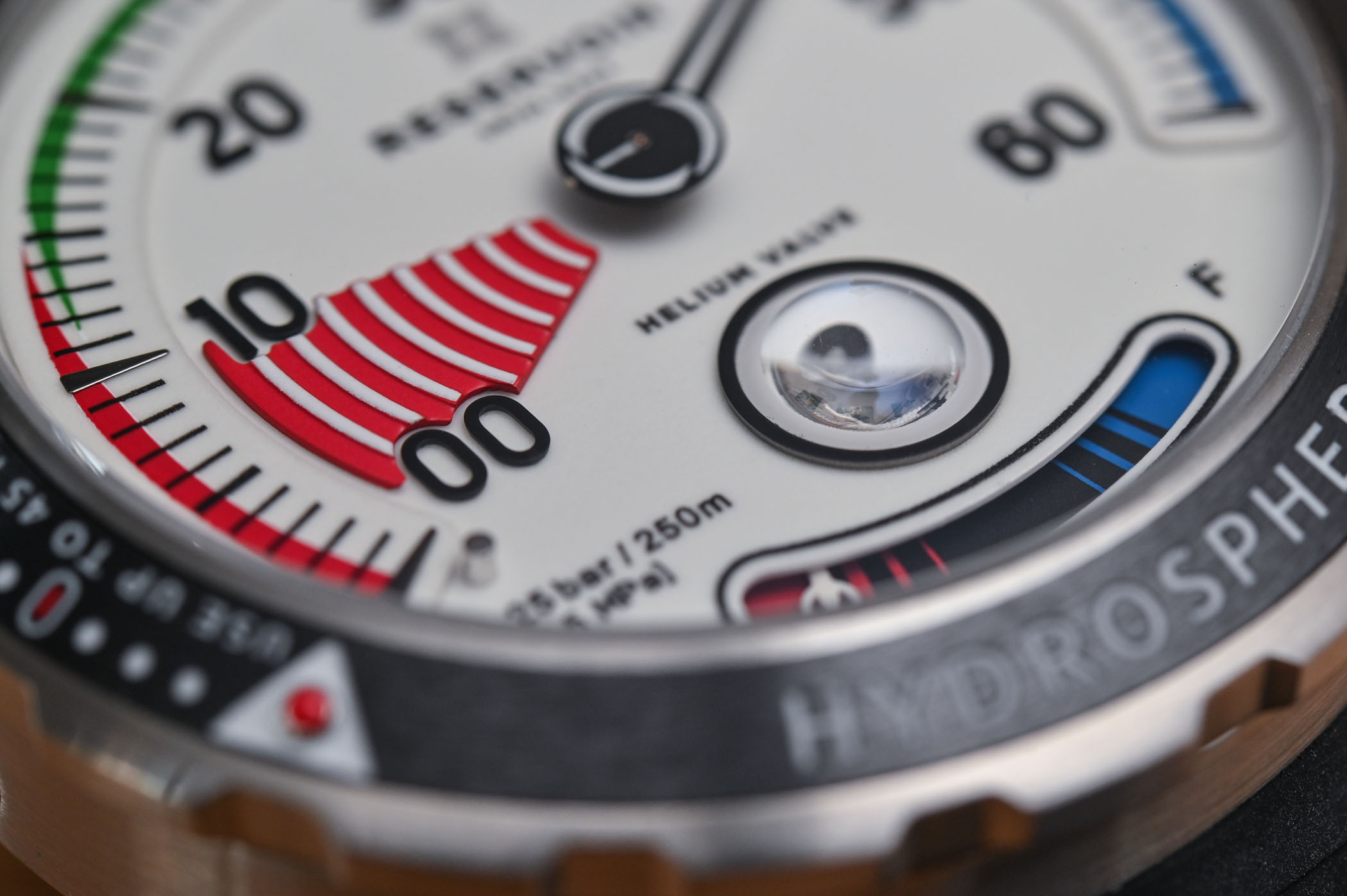 As for the design of the dial itself, the resemblance with old manometers is rather obvious, with the use of a striped red zone from 00 to 10 and a specific style for the minute track. Large applied numerals and a highly contrasting black minute hand allow for a quick consultation of the time. Same goes for nighttime legibility… Which is also when the Reservoir Hydrosphere “Air Gauge” is at its coolest.
