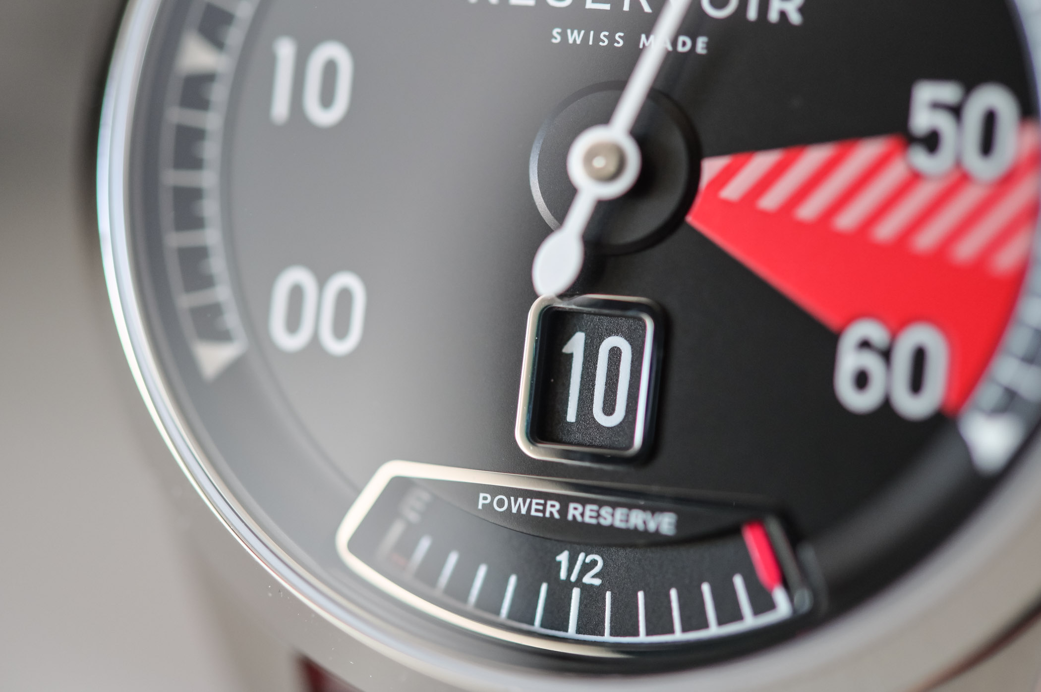 The Reservoir Supercharged Sport Red Zone II we are going hands-on with here is an edition that is inspired by retro racing design and analogue dashboard instruments of classic cars. Its black dial features a 10-minute red zone, reminiscent of red zone danger areas on rev counters. The power reserve is displayed via a large aperture on the lower part of the dial and echoes fuel or oil gauges with “E – ½ – F” inscriptions. The sloped retrograde minute indication, the applied logo and framed hour and power reserve display provide great depth to the dial. Naturally, the display is a bit unusual at first but it is cool and perfectly functional. All the indications contrast clearly against the black dial providing instant legibility.