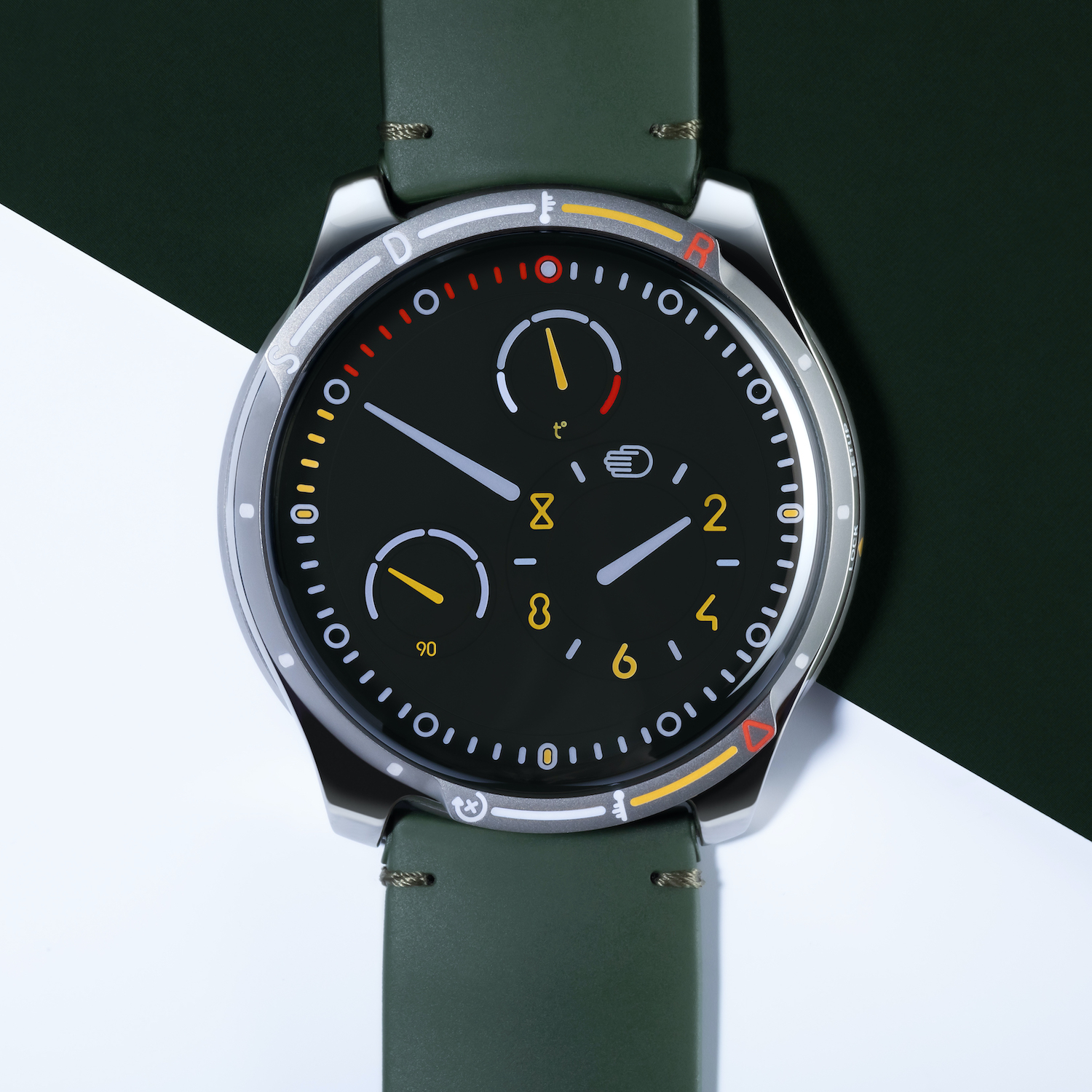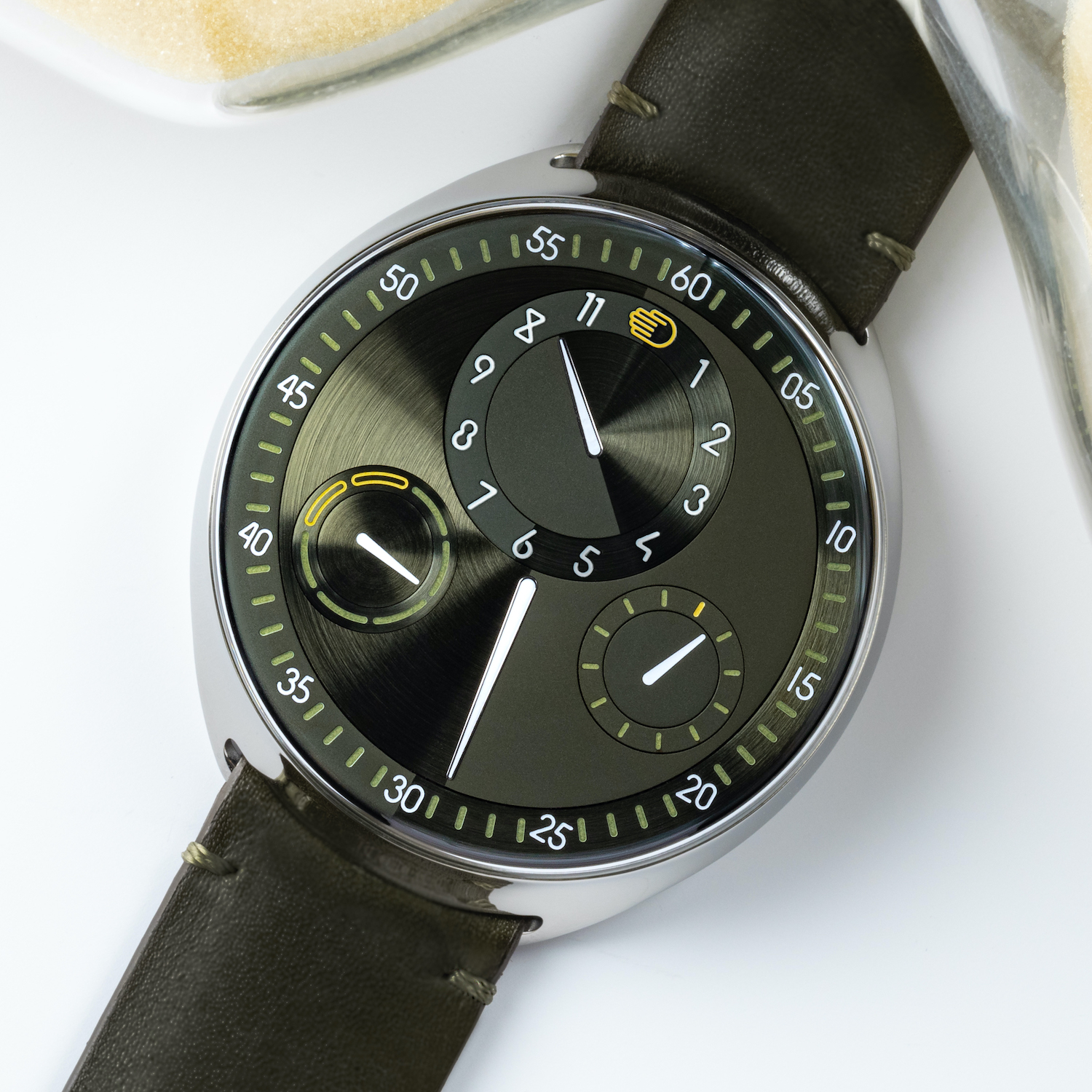 The Ressence Type I Squared X Time by Colour comes with a matching olive green calfskin strap and titanium pin buckle. It is limited to 40 pieces and retails for EUR 23,200 (incl. VAT).