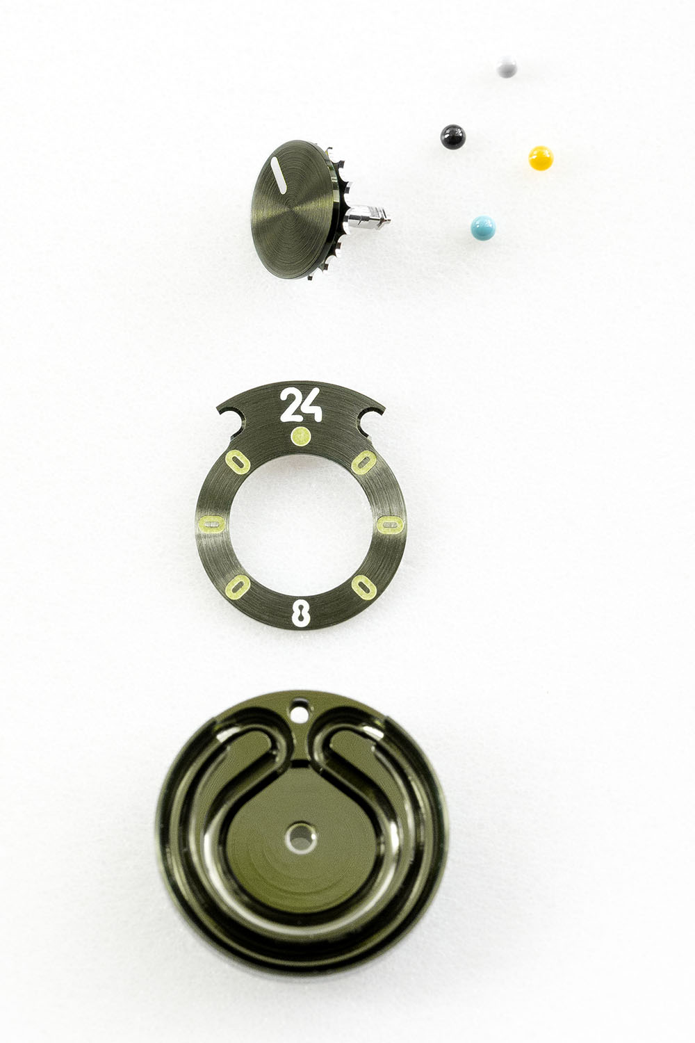 The patented ROCS 1 module is driven by the minute axle of a customised automatic ETA 2892/A base calibre. Beating at 28,800vph, the hours, minutes, days of the week and ‘time by colour’ will keep rotating for 36 hours.