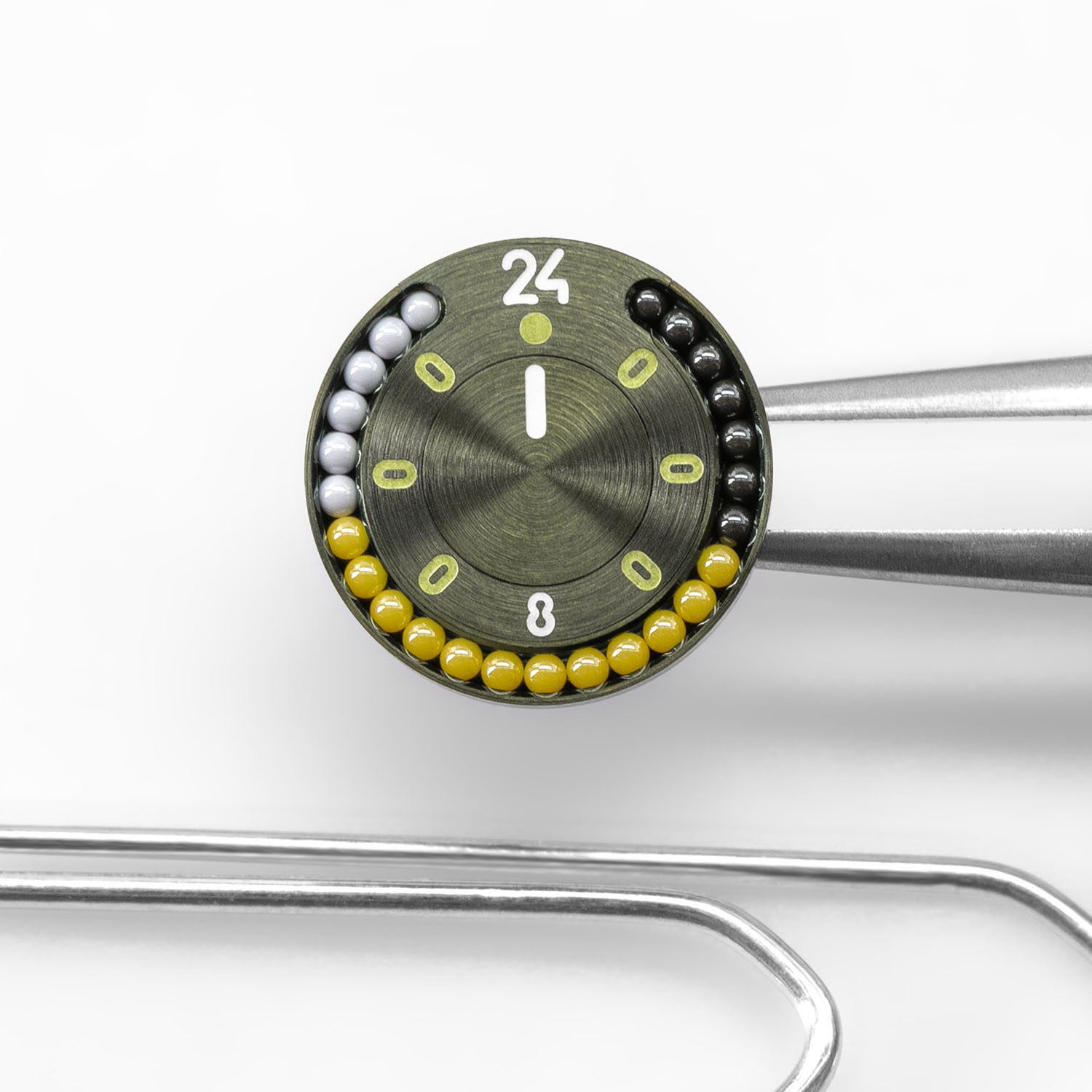 Putting theory into practice, Ressence has taken Prof. Harvey’s findings and incorporated 48 coloured ceramic balls to indicate the approximate time at a glance. Four different coloured balls – yellow, grey, blue and black – placed on a rotating sub-dial (usually reserved for the small seconds) are used to indicate the different moments of a day. The morning hours, starting at 6 am, are represented by yellow beads (like the sun rising) while the evening hours, starting at 6 pm, are blue. Although there are four colours, you will only ever see three colours represented at any one time on the dial.