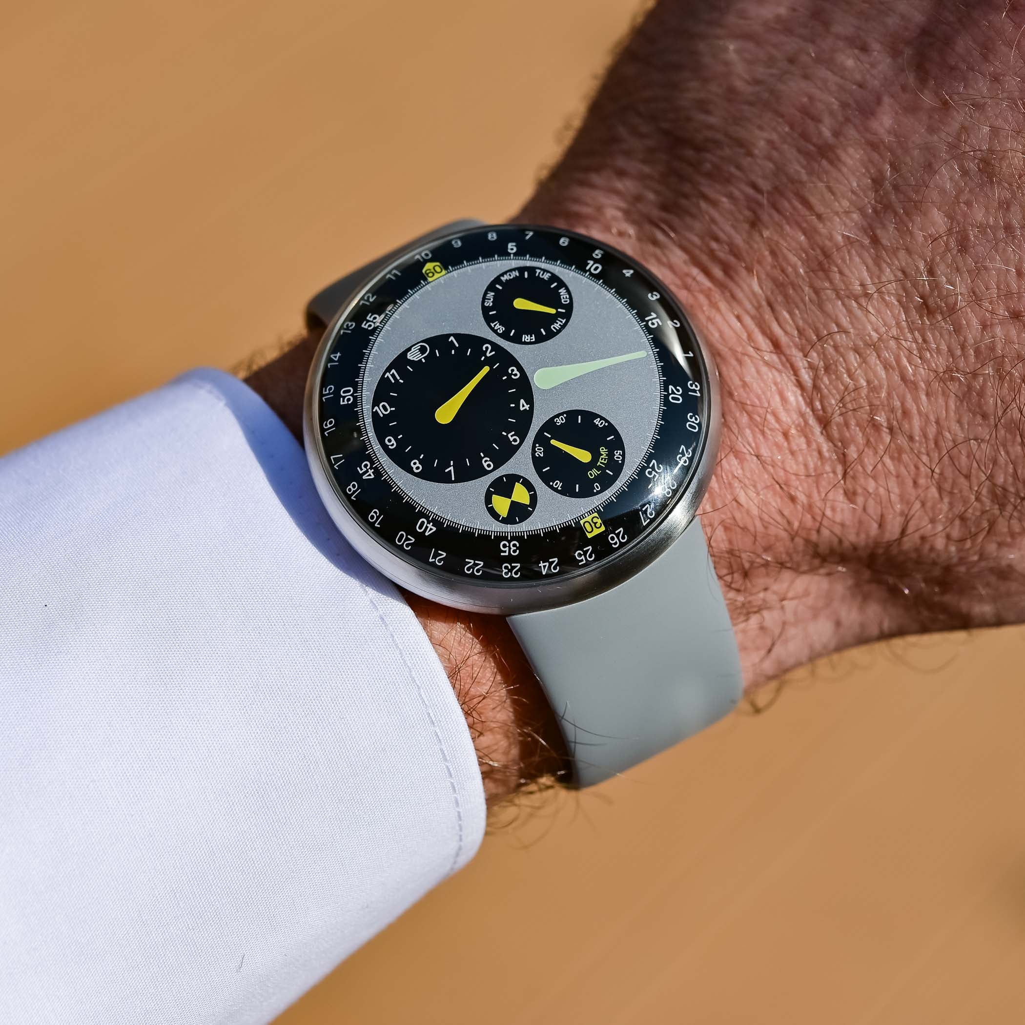 The colours, chosen by Newson, combine celadon green, grey, black, and yellow accents, a restrained yet vivid composition that recalls his design vocabulary across Ikepod, Apple, and his industrial work. Minimal, domed hands subtly echo the man’s DNA and past creations, while maintaining the fluid legibility that defines Ressence’s aesthetic.