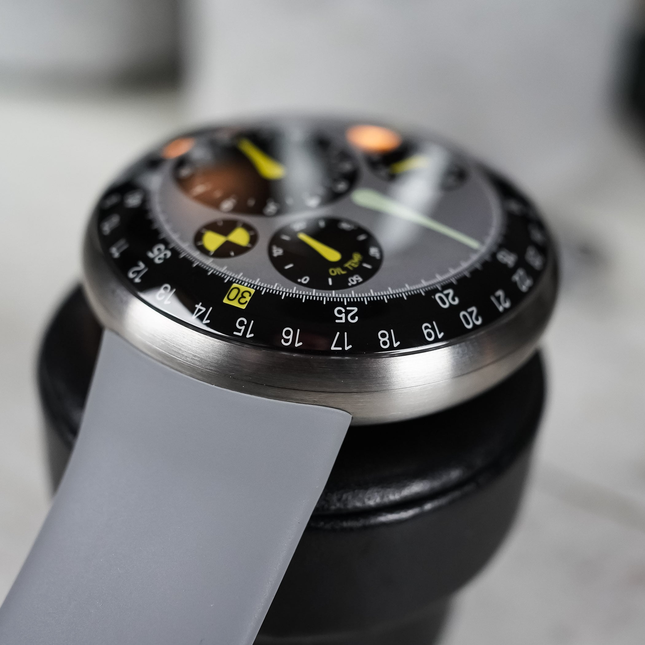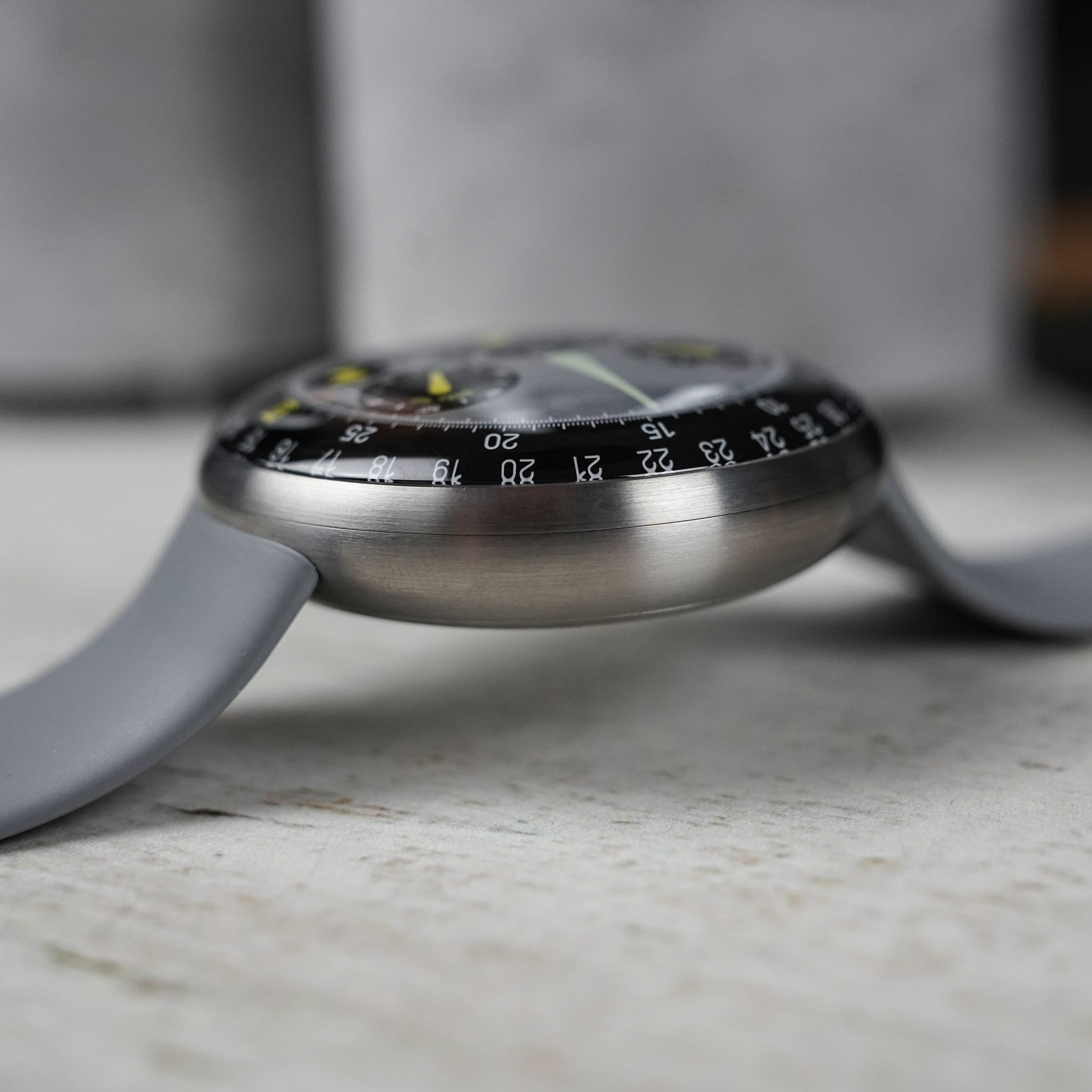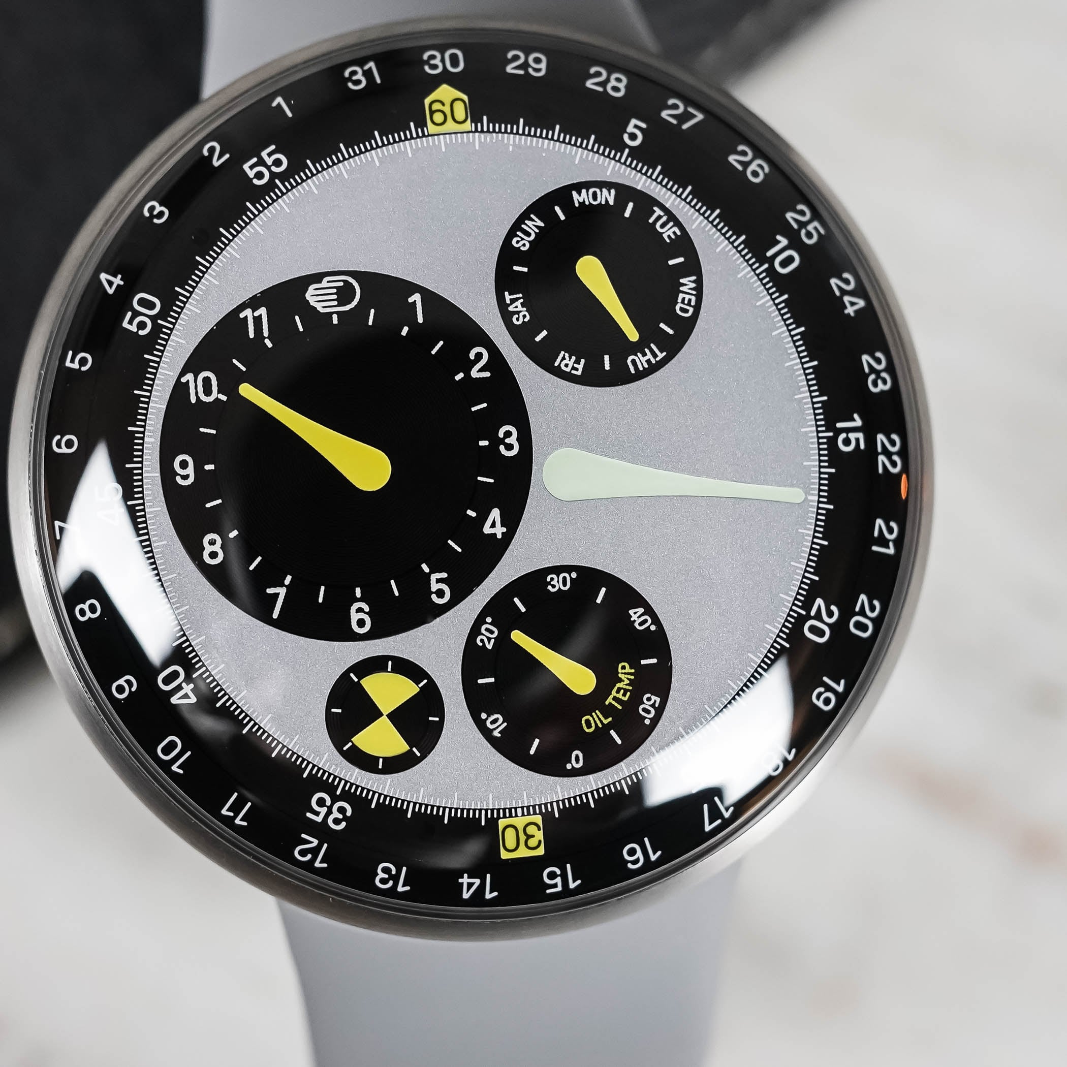 The colours, chosen by Newson, combine celadon green, grey, black, and yellow accents, a restrained yet vivid composition that recalls his design vocabulary across Ikepod, Apple, and his industrial work. Minimal, domed hands subtly echo the man’s DNA and past creations, while maintaining the fluid legibility that defines Ressence’s aesthetic.