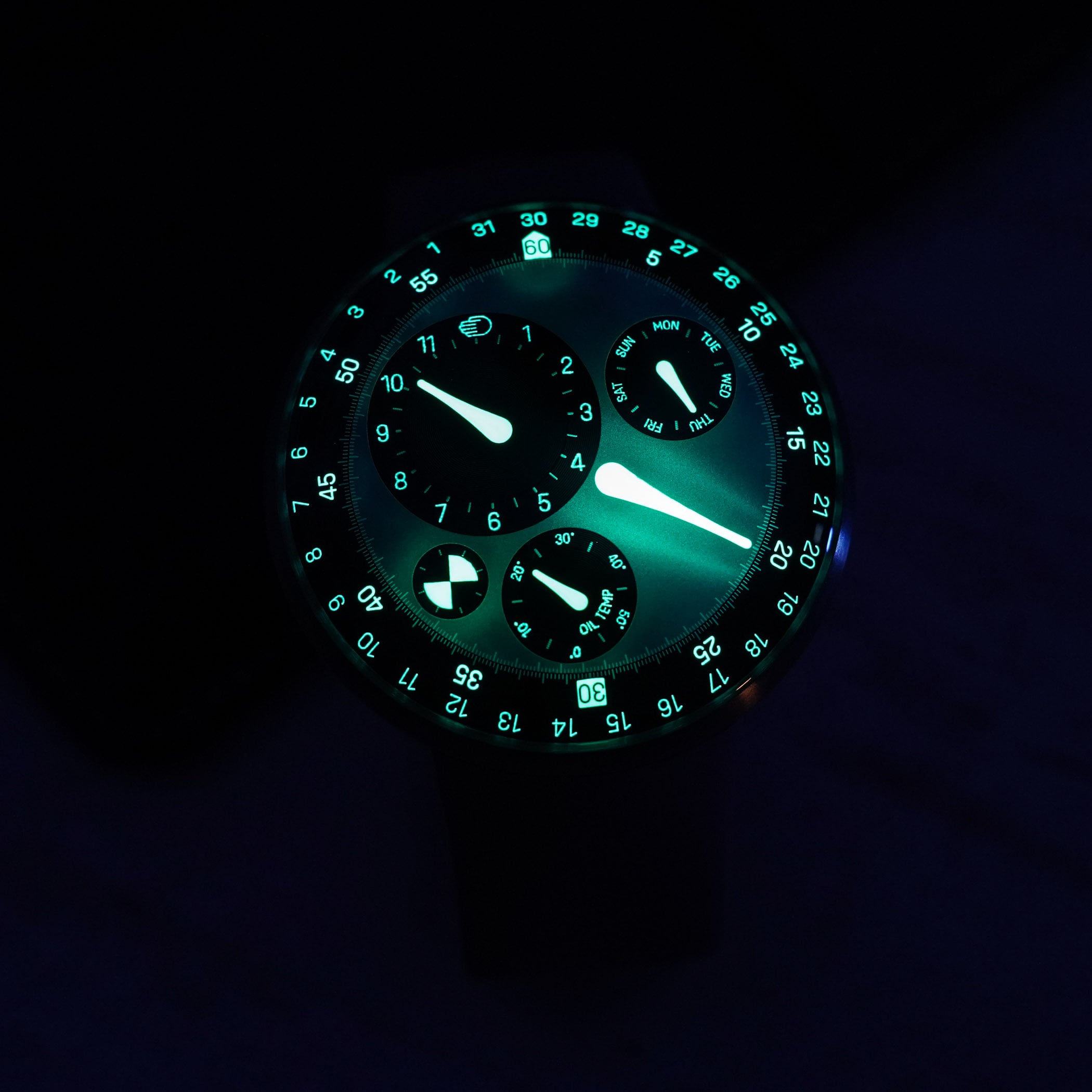 The dial is where the two worlds truthfully merge. Ressence’s ROCS 3.6 (Ressence Orbital Convex System) replaces traditional hands with rotating, convex titanium discs that orbit in unison. In the Type 3 MN, these discs are made from DLC- and PVD-coated titanium, engraved and filled with Grade A Super-LumiNova in blue and green, and arranged across four eccentric biaxial satellites. The layout displays hours, minutes, running seconds (180s), day, date, and oil temperature, but what attracts is the perception of time, as the entire dial seems to float directly beneath the sapphire, thanks to the oil-filled upper chamber that eliminates refraction.