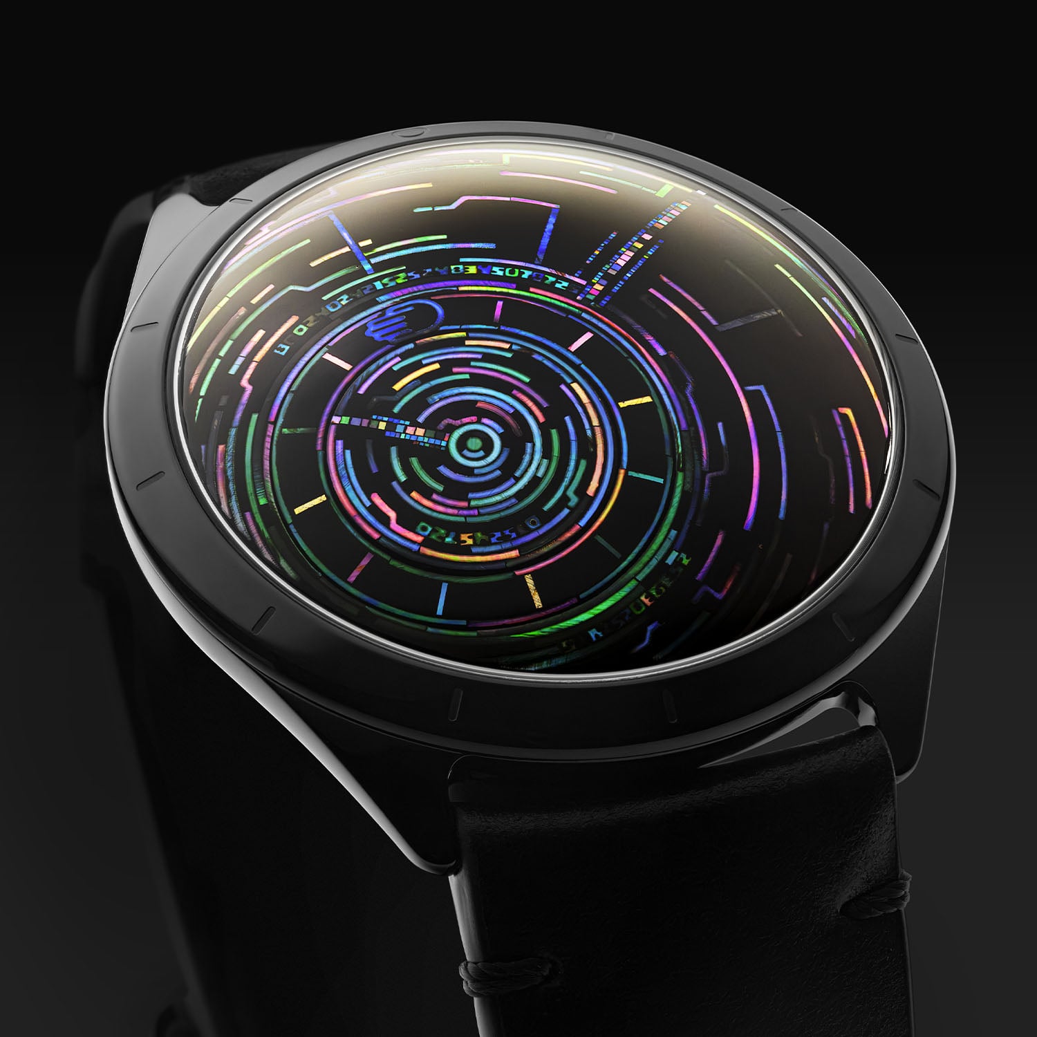 Specifically designed for the moving dial with Ikeda’s futuristic design language, the convex dial features a series of colourful, discontinuous lines that emanate concentrically from a vortex (axis of the hour hand). To stand out, the hour and minute hands are highlighted with small colourful squares. While the effect is something you might find in Stanley Kubrick’s sci-fi movies, Ikeda achieves it using ancestral techniques. Composed of layers of black lacquer and mother-of-pearl inserts, the difficulty was to attach the flat slivers of nacre to a curved surface. The solution, Ikeda discovered, was to soak them and slowly bend them to match the dial’s curvature. Although it is not explicit in the press release, the mother-of-pearl strips must have been painted with luminescent colours to create the glowing rainbow palette.