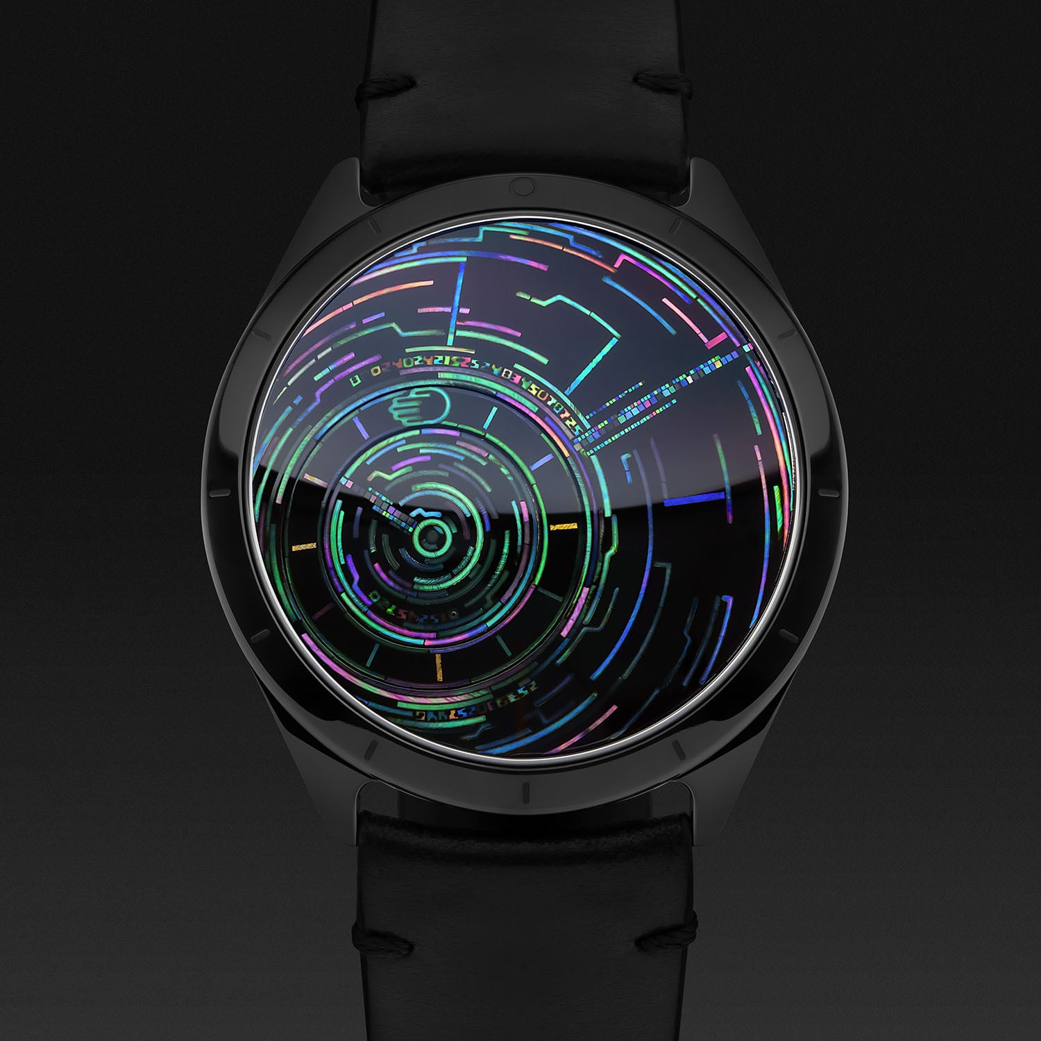 The compact 39mm Type 9 titanium case has been given a black DLC makeover for the collaboration. With no protruding crown to interrupt the ergonomic flow of the flying saucer silhouette, the 11mm-thick case can be worn on either wrist. Powered by Ressence’s patented Orbital Convex System (ROCS), the domed dial rotates once per hour, aligning the long pointer hand with the minutes track on the external black DCL-coated bezel. The smaller disc for the hours is also set in motion and performs a revolution every twelve hours, following the minutes around the dial in a never-ending dance.