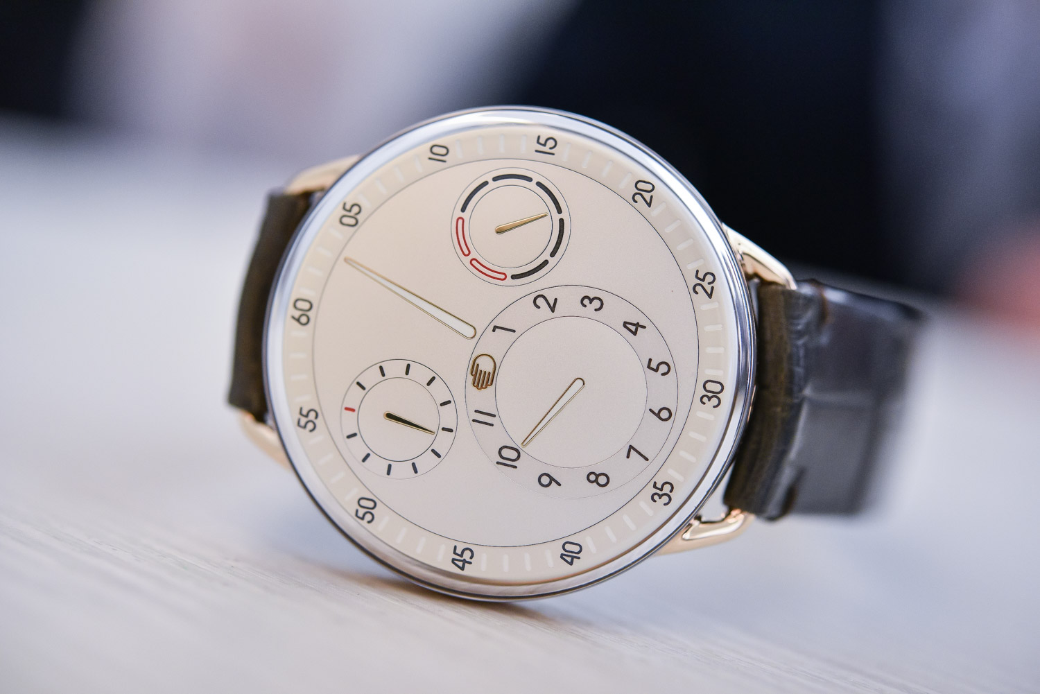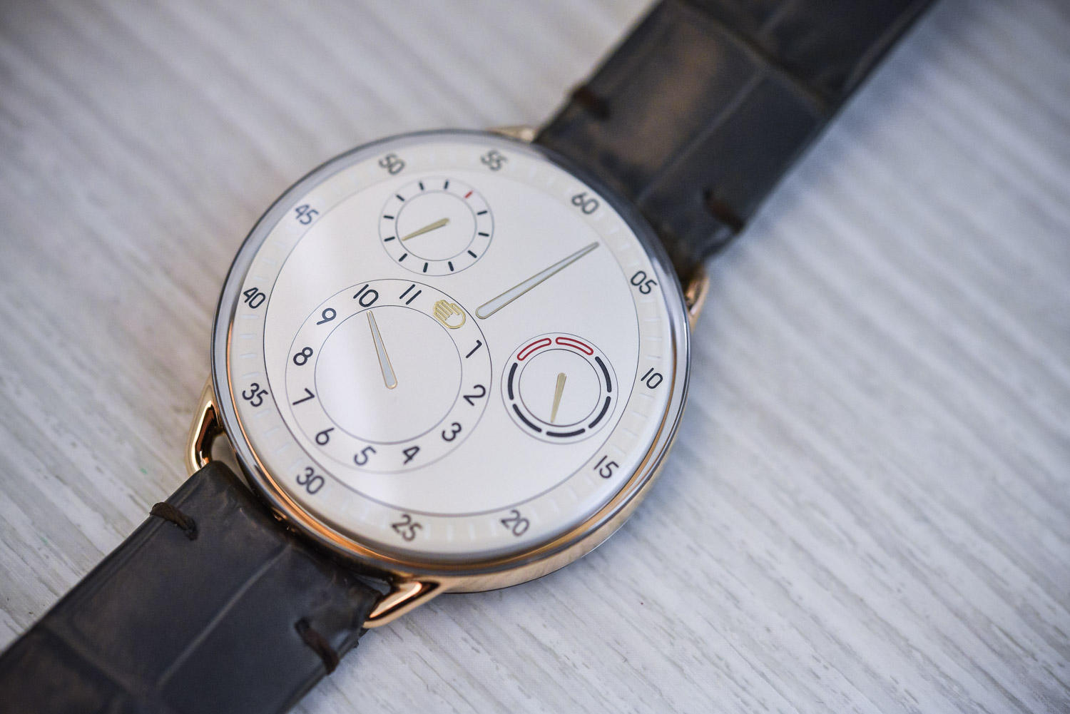 The second option is my personal favorite; the Ressence Type 1 PW MRP. Whilst the functionality remains the same as the Type 1 PN MRP, the look and feel is completely different. This is because in this version, the 42mm case has been milled from a single block of 18k 4N Rose Gold. This case is paired nicely with a sandblasted white dial, with a few gold highlights and some splashes of red. It seems strange to say this but it almost gives the watch a slightly vintage feel, which is bizarre because Ressence watches are known for their ultra-modern time-displays. Personally, I really like it, plus it looks super cool on the wrist. Sadly, though it is limited to just 6 pieces, which is great if you value exclusivity but sucks if you’re the 7th person that tries to buy this watch. Completing the watch is a numbered and engraved caseback and brown leather strap with Ardillon rose gold buckle.