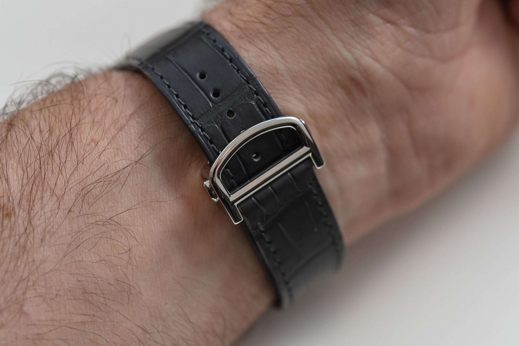 The bracelet is nicely executed alternating brushed and polished surfaces and is closed by a folding buckle. It gives this 2020 Pasha de Cartier a sportier look. Once mounted on the dark alligator strap, the watch gains in comfort (it is obviously lighter) and in casual elegance. The strap is matte for a modern look and equipped with Cartier’s classic folding buckle.