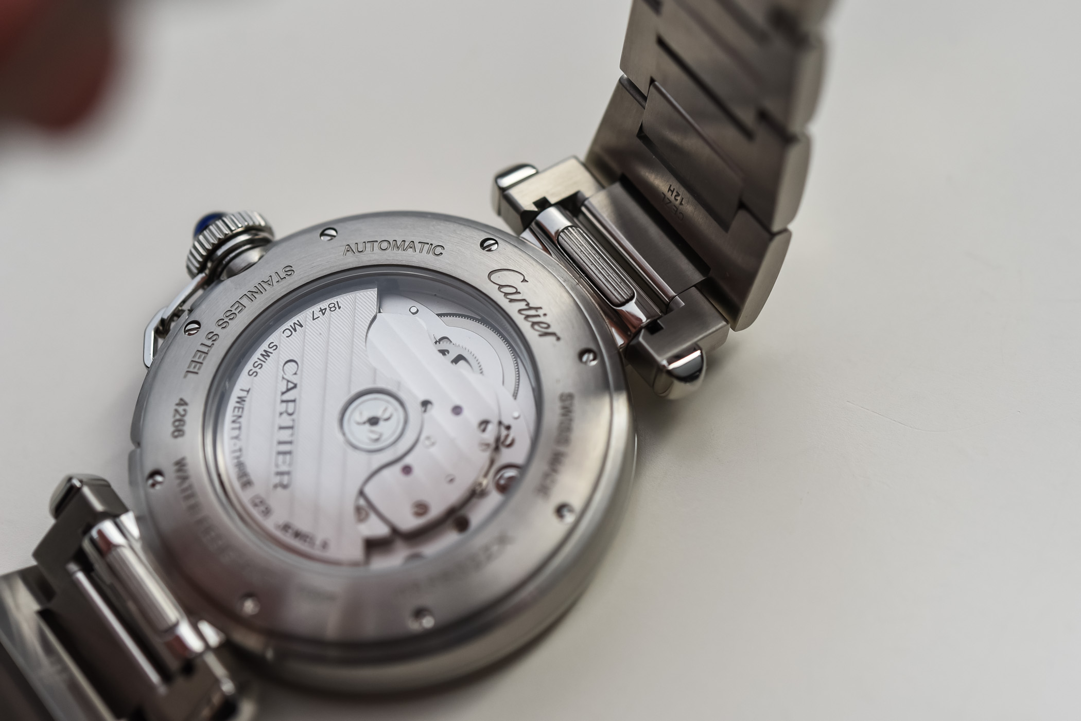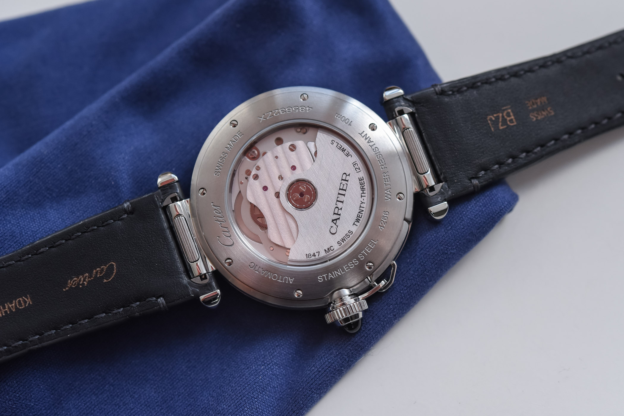 Powering this new Pasha de Cartier collection, and used in both 41mm and 35mm 3-hand models, is a manufacture movement. Produced in Valfleurier, calibre 1847 MC is the entry-level automatic engine of the brand replacing the former ETA calibres and clones. To counter the magnetic fields we are exposed to these days, Cartier has beefed up the anti-magnetic properties of the movement. Calibre 1847 MC uses non-magnetic nickel phosphorous components for the escapement mechanism as well as a shield made of a paramagnetic alloy. The movement beats at 4Hz, offers 40 hours of power reserve and is pleasantly decorated with Côtes de Genève on the rotor and bridges.