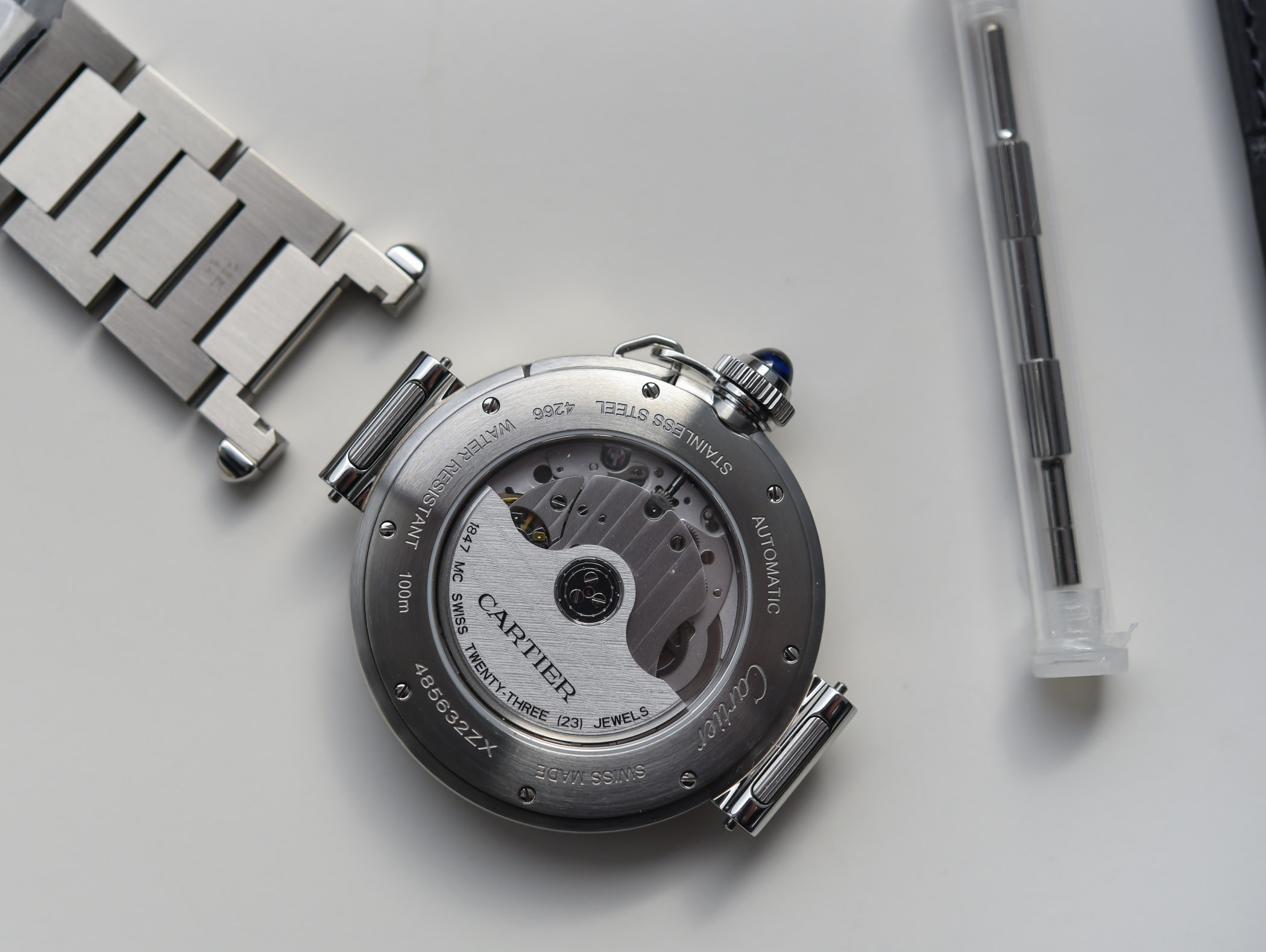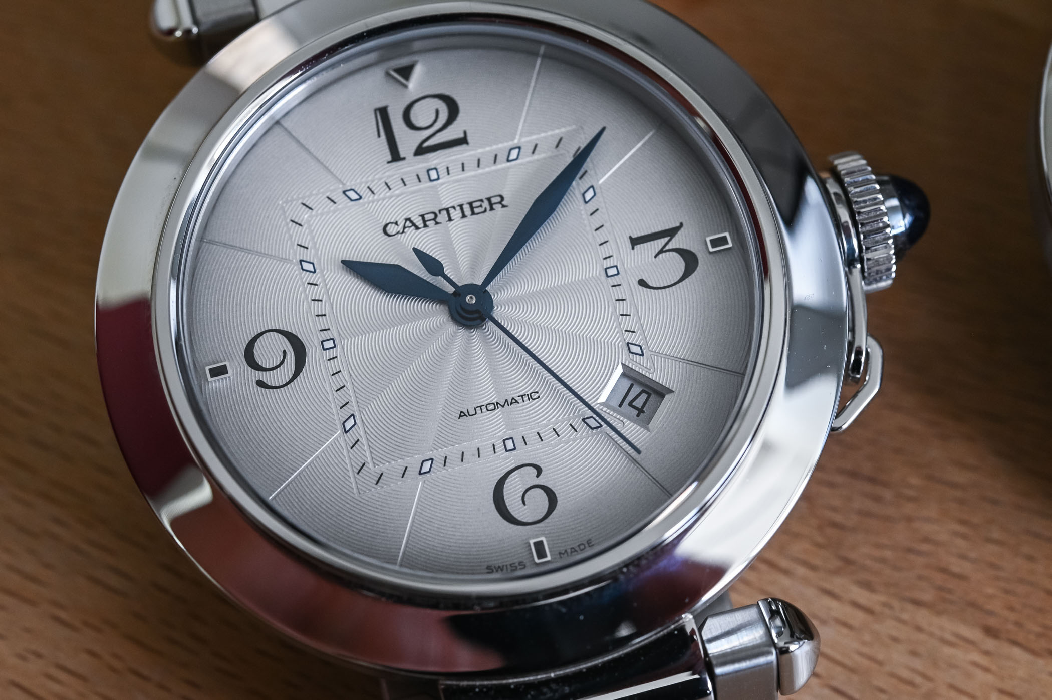 The new Pasha is still very much a Pasha with its round case and hallmark capped-crown-and-chain device along with the distinctive way the strap is attached to the case. Designed and patented by Louis Cartier in 1934, the Vendome-style bars that traverse the strap/bracelet feature rounded pyramid shapes at the ends (aka Clous de Paris extremities). The model we have here is the 41mm stainless steel with a slender height of 9.95mm, pretty thin if you consider that it is water-resistant to 100m.