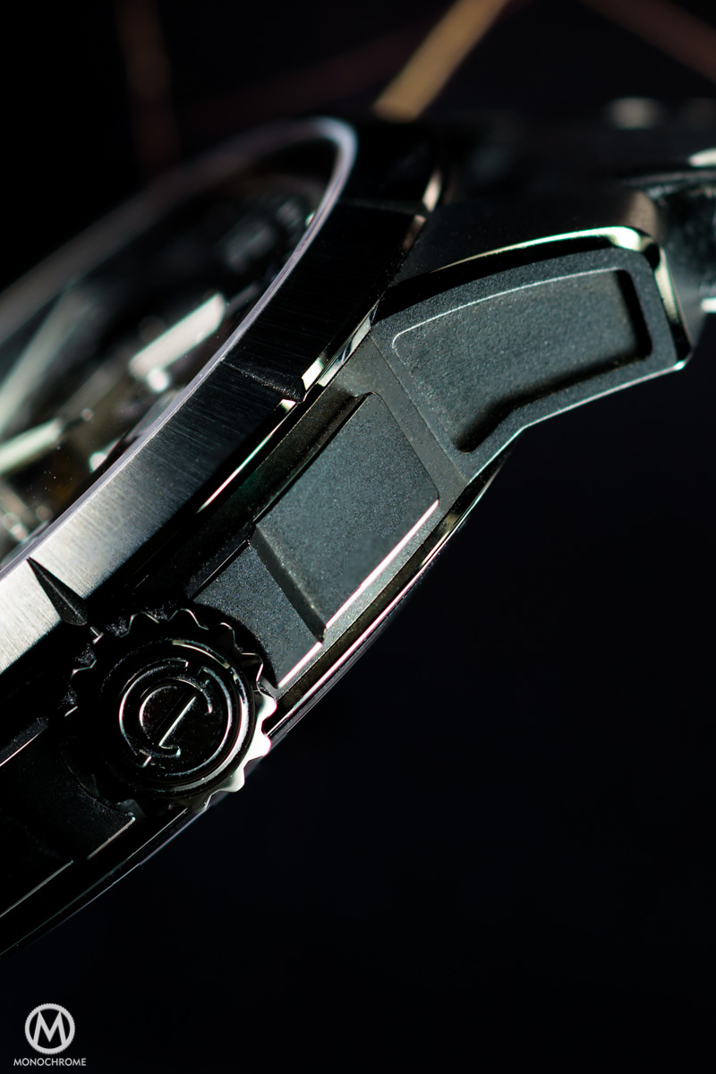 The shape of the case and lugs as well as the cutouts in the bezel gives the watch an industrial look. The black PVD coating of the steel case contributes to this look as well. The crown is “embedded” in what seems like a two-story building. That also seems to add a “layer” when you look at the right side of the watch. A wonderful design job. What about the size? The case measures 46.80mm and is 13.20mm thick. Large but it is still comfortable on the wrist.