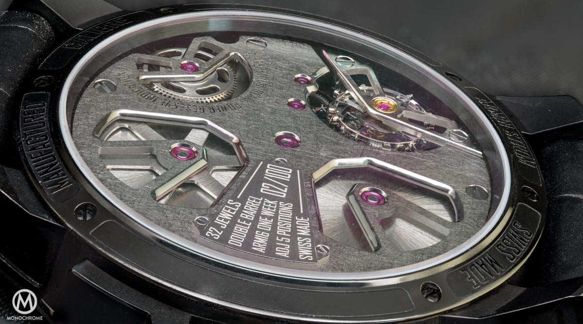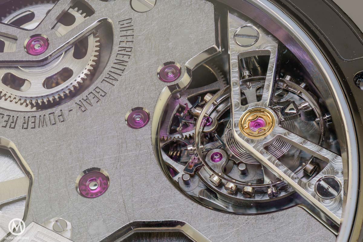 We also admire the watch from a design perspective. For example, look at the positioning of the jewels. With some fantasy, you see an antenna or an Eiffel tower, depending on how you look. The asymmetry continues in the movement: off-centered jewels for the hour and minute hand pinion, heptagon-shaped holes for the barrels and dome-shaped holes for the power-reserve indicator and escapement, differences in angles between the for barrel bridges versus those of power reserve indicator and balance wheel. All in all a unique, industrial-looking and beautifully finished movement.