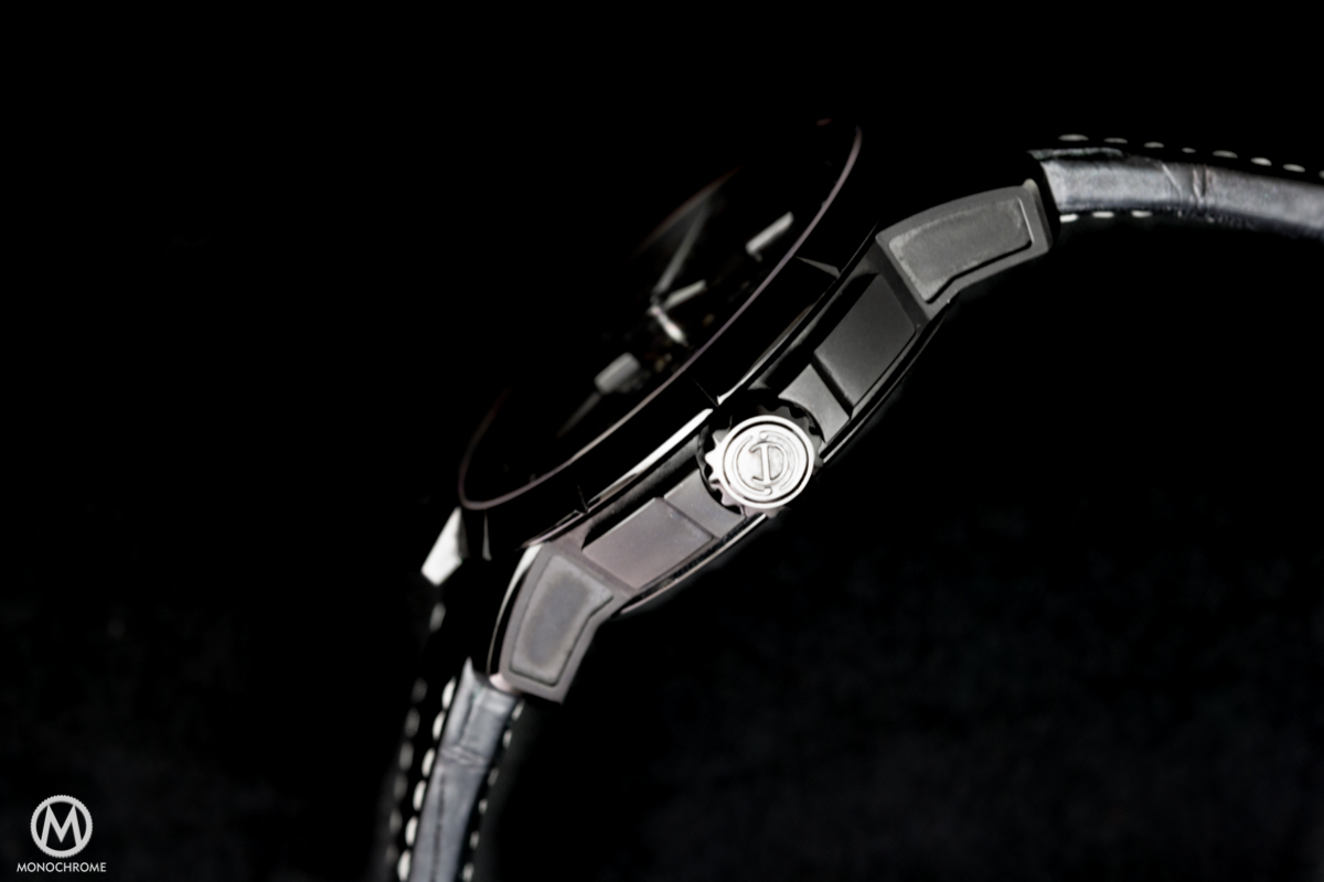The strap is made of black alligator leather. Its thickness matches the size of the watch. Rather than being artificially thickened, the leather feels sturdy yet soft. The white stitching gives a nice touch. This is clearly one of the best straps we have seen. The watch comes with an ardillon buckle in stainless steel with a PVD black coating or a double-folding clasp in black PVD stainless steel.
