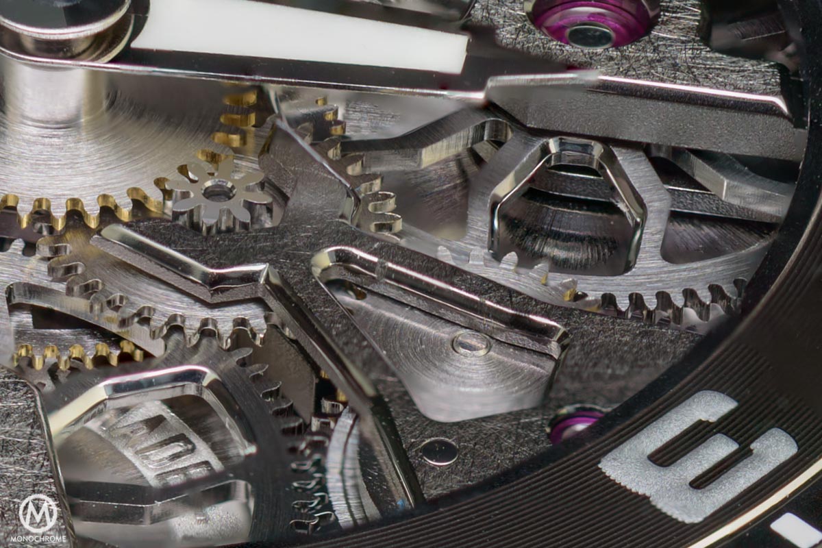 Much attention has been paid to the finishing. It is a difficult job that has been executed superbly: polished sides of the bridges and wheel spokes, polished jewel and screw holders, brushed wheels and gears. The only thing that may raise your eyebrows is the finishing of the balance bridge, which is pèrlage (or circulair graining in English) and does not quite match, or fit in with, the finishing of other parts. Something you may like or dislike.