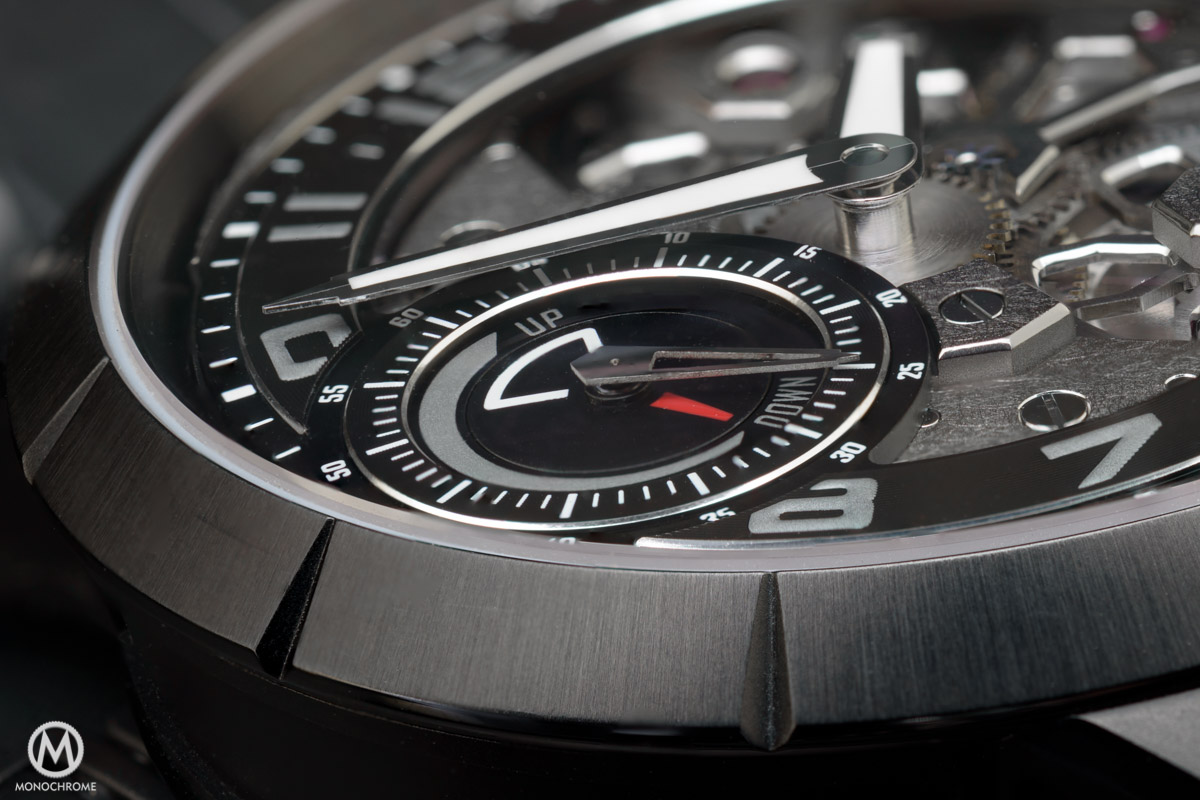 The design is functional yet bold. It combines the finesse of skeletonized watches with the robustness of sports watches. When you look at the watch from a bird’s eye view, you notice various circles: the bezel, hours/minutes embraced with what seems a waxing-crescent-moon in metal-color that seems to nurture time, the hours/minutes dial, and three smaller symmetrically positioned circles, one being the sub-dial with seconds and power-reserve and two being barrels. The gear in the off-centered middle seems to connect barrels and sub-dial. At first sight one may say “the dial isn’t round but eccentric” but in reality it isn’t. Depending on how you look, the large hands are in the middle… or not given the view. The grey colour variations and patterns match well and the silvery white hour markers are clearly legible. The power reserve indicator in bright red makes it clearly distinguishable from the second hand.