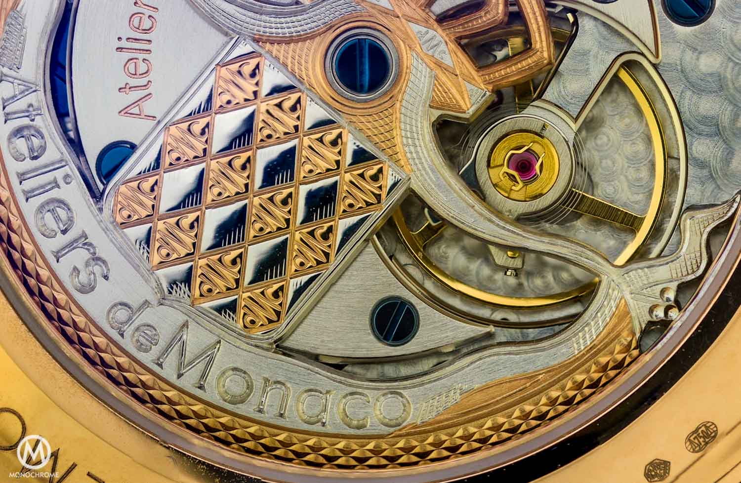 In fact, everything started with the dream of Pim Koeslag to develop a minute repeater – which has been done – but that posed an real issue. Indeed, such a complex and of course costly movement couldn’t just not fit with the segment of the market Frédérique Constant targets. While these two found the movement worthy of commercialization, they decided to create a new brand, Ateliers deMonaco. The production of this brand is focalized on complications (tourbillons, minute repeaters, perpetual calendar) or haute horlogerie (as all pieces are finished by hand, with nice decorations, some being even certified by the Hallmark of Geneva). More than that, the brand also serves as a laboratory for Frédérique Constant, as for instance their perpetual calendar has been developed on the roots of deMonaco’s QP and chronograph. Their latest model, the Ateliers deMonaco Admiral Chronograph Flyback Saphir, follows the same idea of complication, mechanics and high-end finishing.