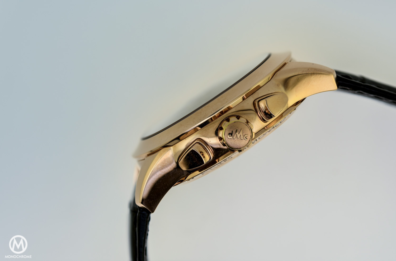 - Movement: dMc 760 Calibre, in-house – automatic – 4Hz frequency – 32 jewels – 38h power reserve – hours, minutes, small second, flyback chronograph