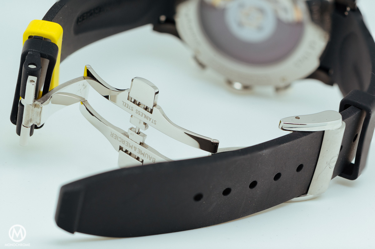 The triple folding clasp is well made and works excellent. The lugs are curved in such a way that the case rests comfortably on the wrist (and yes, the rubber strap – like all rubber strap – attracts dust easily.