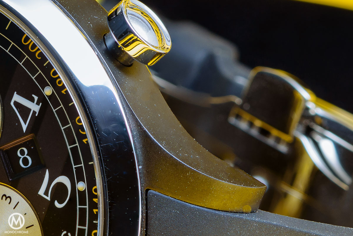 The design strikes a good balance between resemblance and difference with the car. The fonts used for the tachymeter, the subtle stripes between the 4 and 8, the colours used, the case that show resemblance to the headlights, and the chronograph pushers showing resemblance to the engine valves.
