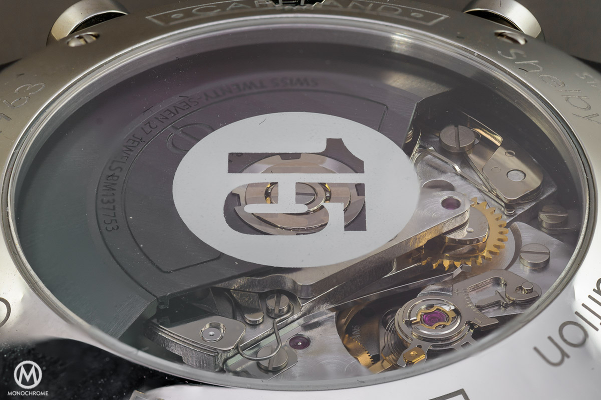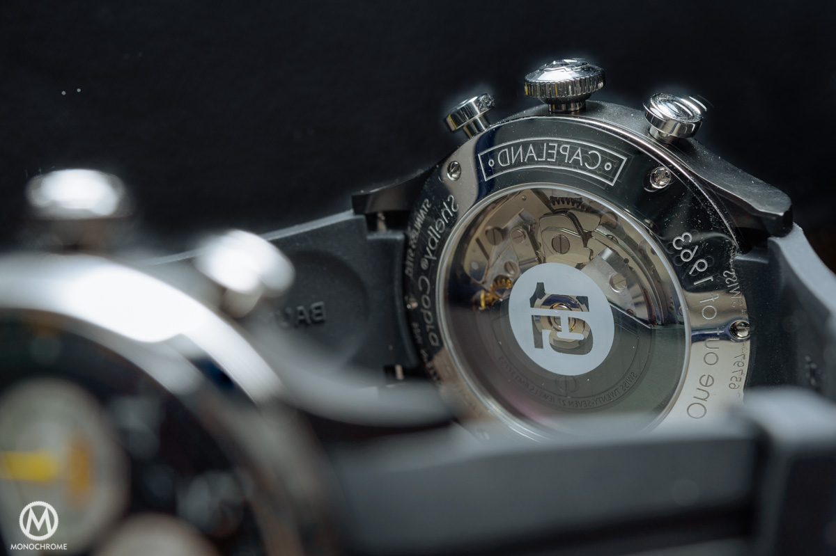 The watch houses a Valjoux 7753-based movement manufactured in the Richemont factory in Valfleurier. The rotor looks nice and the semi-transparent label with the number of the car gives a nice touch. Otherwise, the movement is standard. We haven’t tested accuracy and reliability, but the movement has proven itself over the years. So rather than further describing it, let us show photos that gives you an impression of the ‘layers’ in the movement. By the way, the chronograph pushers are not buttery soft but work well. And the chronograph jumps back to the exact 12 position, not to a fraction of a second before or after the 12.