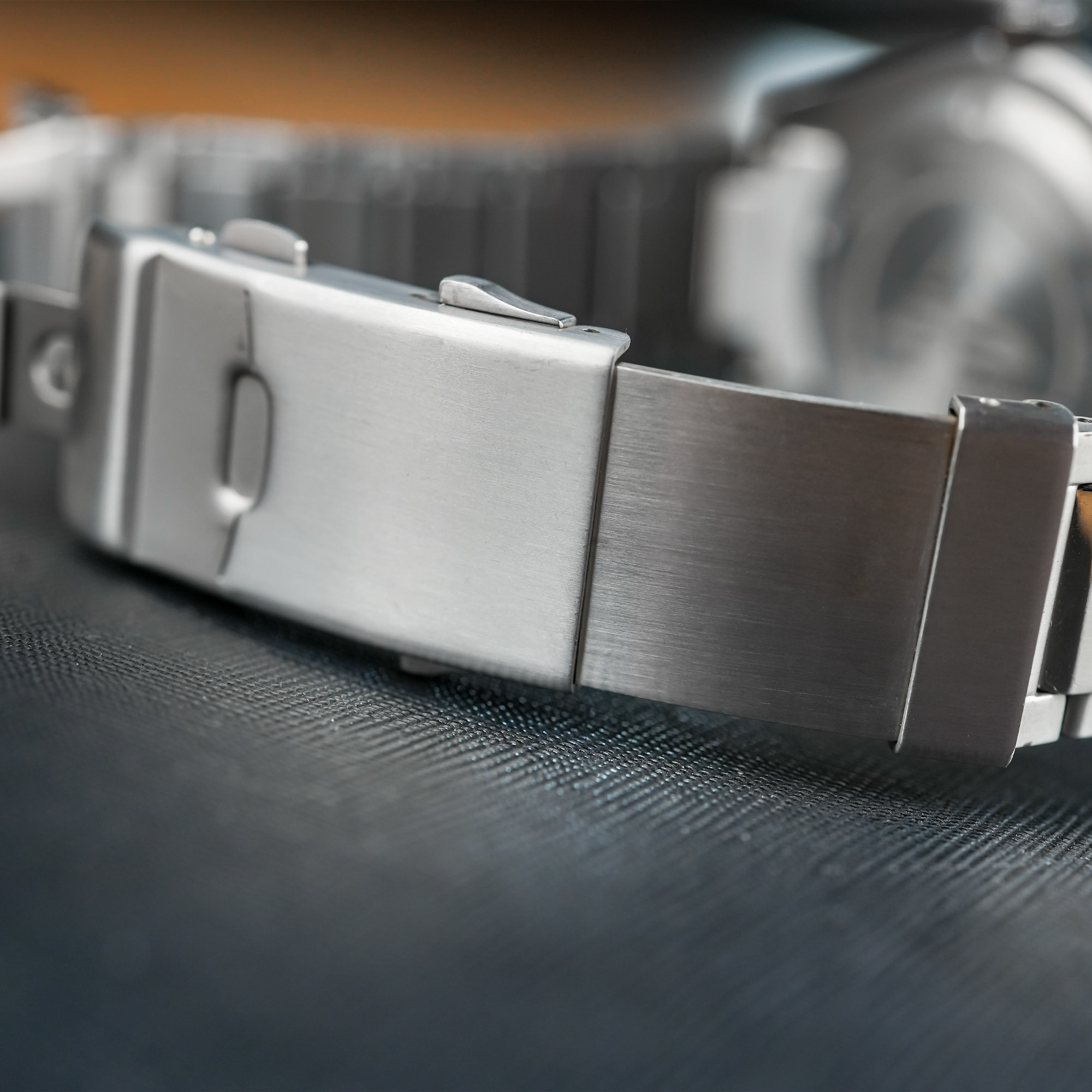 This Promaster 35th Anniversary “Fujitsubo” Titanium Diver 200m is secured to the wrist by a three-link Super-Titanium bracelet with the same Duratect Platinum surface treatment as the case. It is closed by a folding clasp with multiple tricks: a security loop, safety-release pushers and a sliding diving extension that can act as both a micro-adjustment and when you want to wear this watch over a wetsuit.