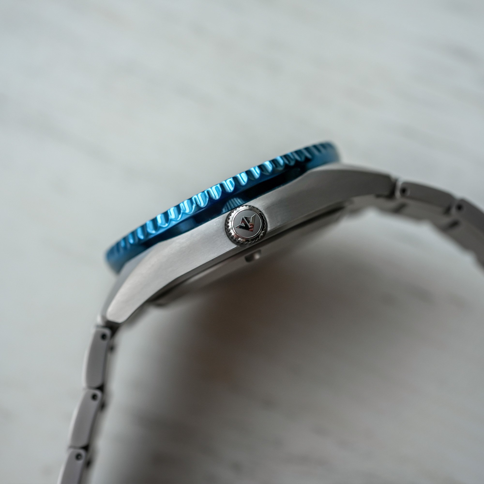 Just like the blue-coated bezel, the dial relies on a new colour – which is said to be inspired by the beautiful blue ocean and white sand of Long Reef Beach in Australia, where the 1983 watch was found. A different blue tone than what’s used on the model from the permanent collection, it retains great contrast with the large raised luminous markers and oversized hands, providing strong legibility night and day, with a green glow at night. There’s a date window at 3 o’clock paired with a luminous plot next to it.